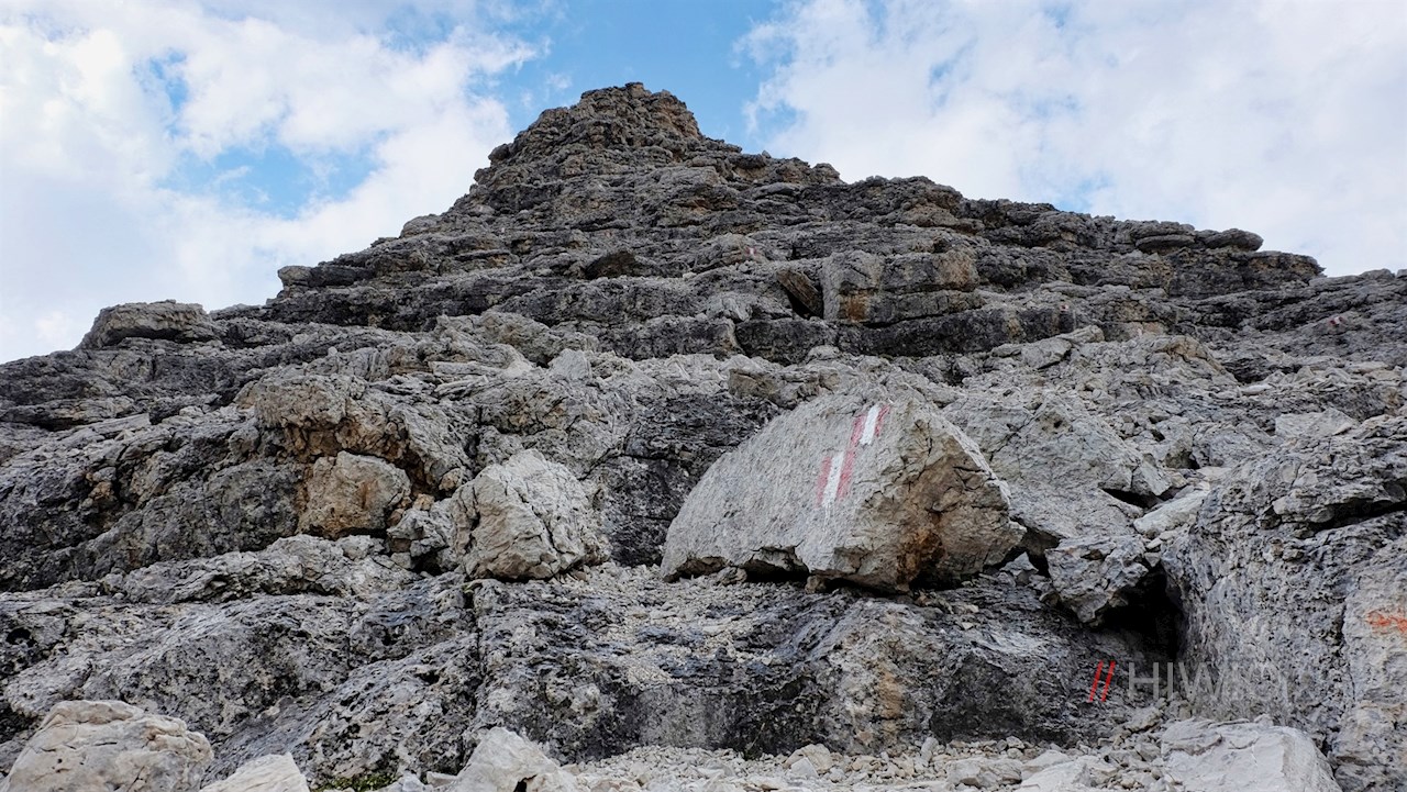 Dem Wegweiser in Richtung Pisciadu-Gipfel nach links folgend, wandert man sodann über die teils geröllbeladene, teils felsdurchsetzte Gipfelflanke zum eleganten Gipfelkreuz auf 2.985 m Höhe empor.