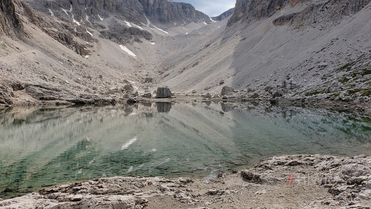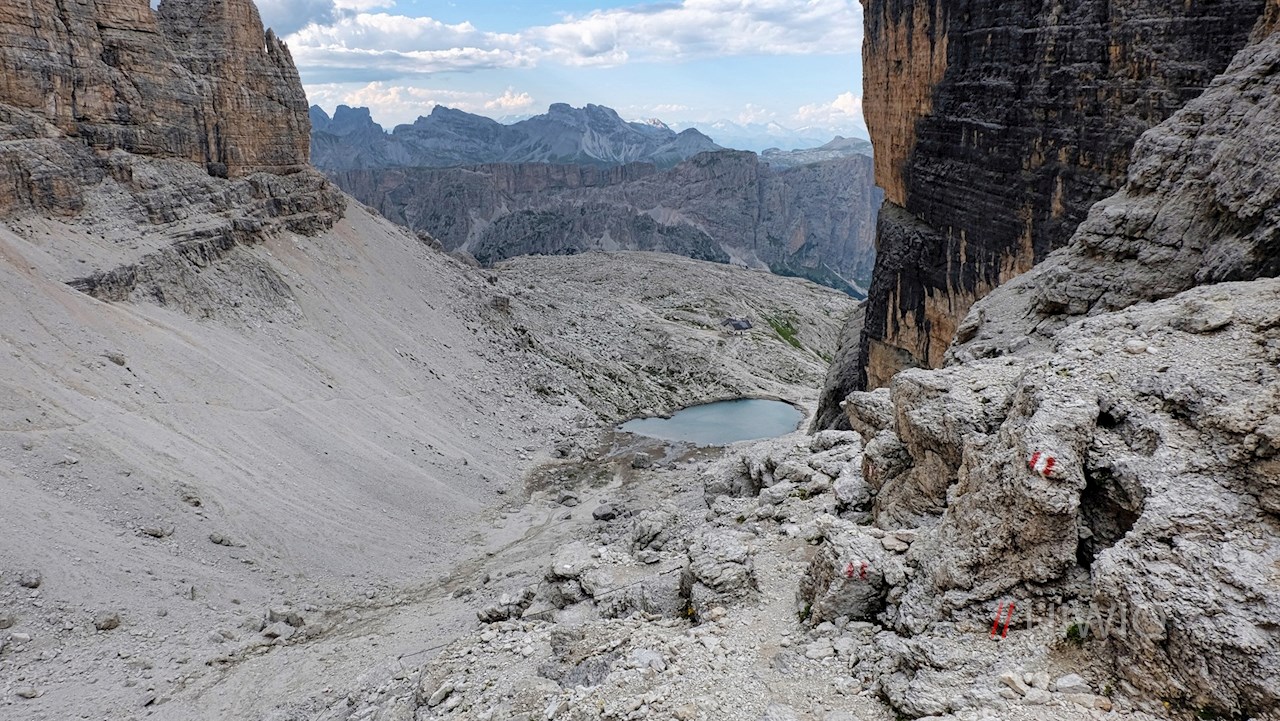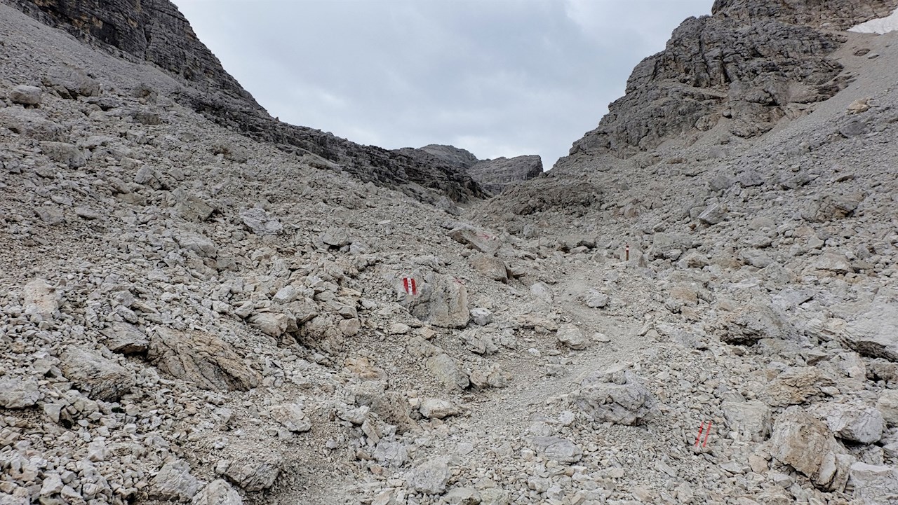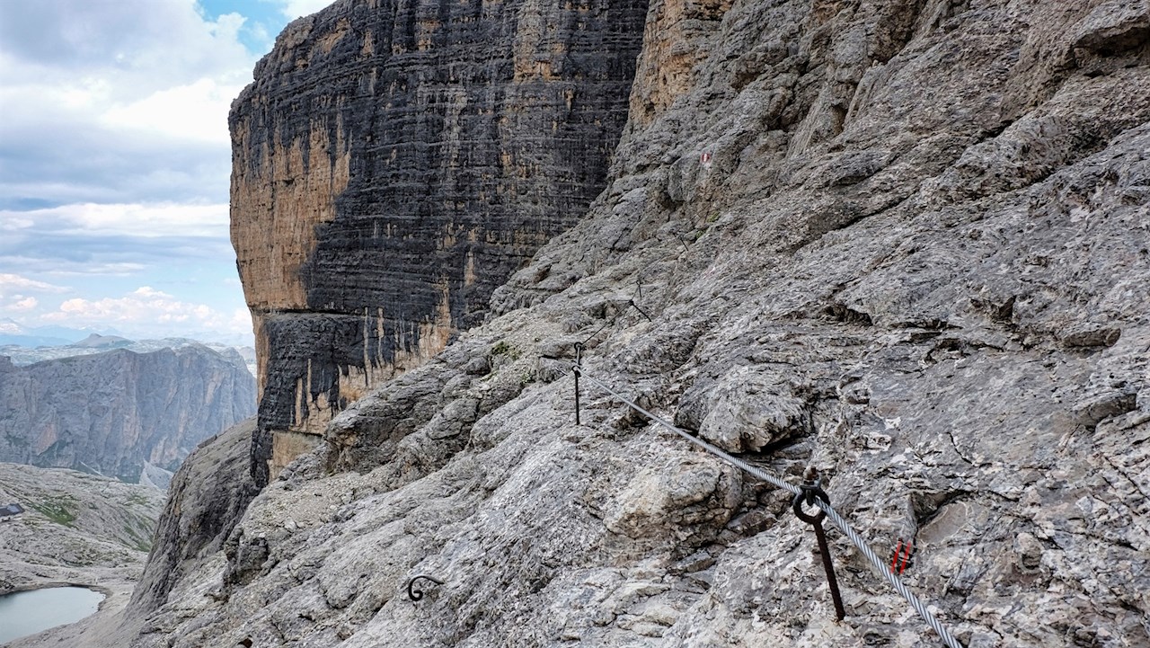 Weiterhin der Wegnummer 666 folgend, wandert man zum malerisch gelegenen Pisciadusee hinab und von dort über Geröllhänge zu einer kleinen Mulde empor. Eine felsige Passage ist dank der angebrachten Fixseile und Steighilfen für berggewohnte Wanderer recht einfach zu meistern.