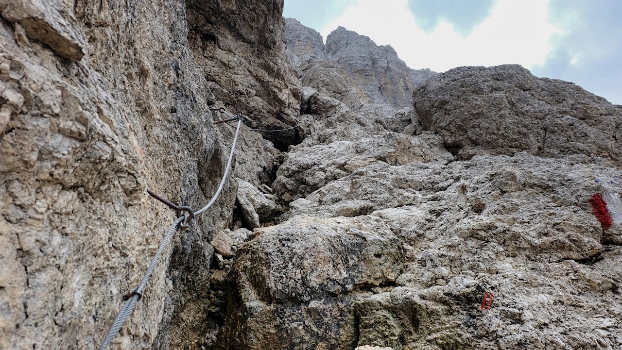 Zuletzt führt er über abschüssiges, teils mit Fixseilen und Steighilfen gesichertes Felsgelände auf das steinerne Hochplateau des Sellastocks an.