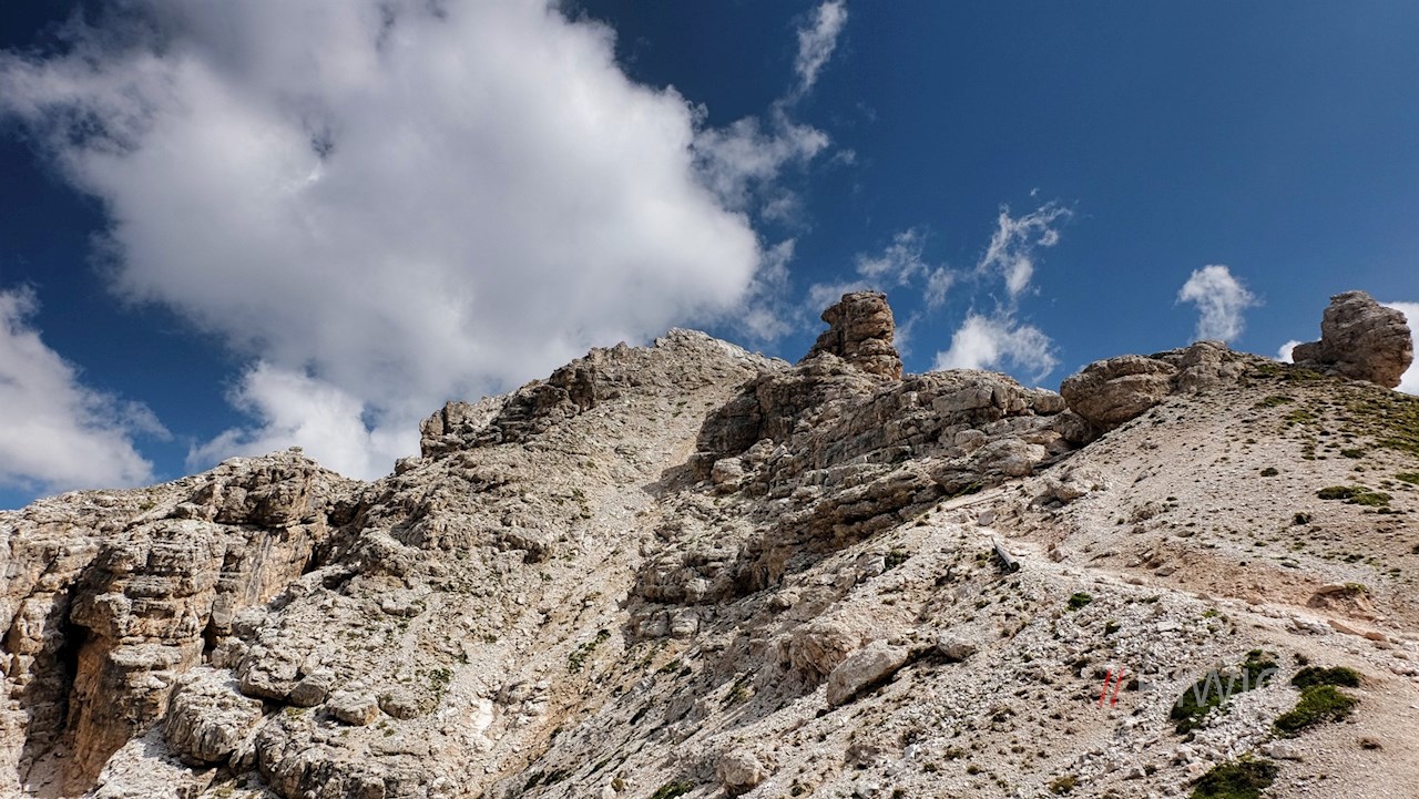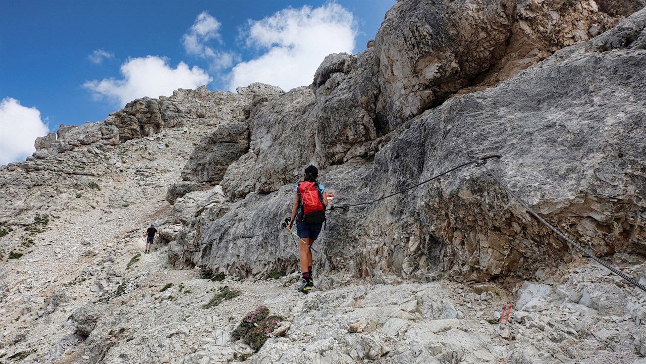 Weiterhin der Markierung Nr. 2 folgend, wandert man sodann über die kalkweißen Felsen und Hänge in Richtung Nives-Scharte. Unterwegs trifft man auf einige seilgesicherte Passagen, die für berggewohnte Wanderer recht einfach zu überwinden sind.