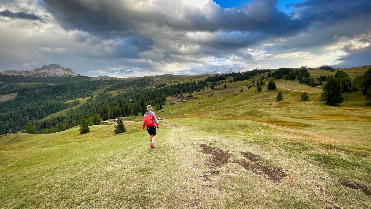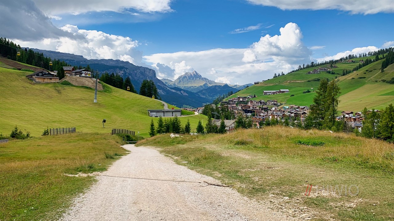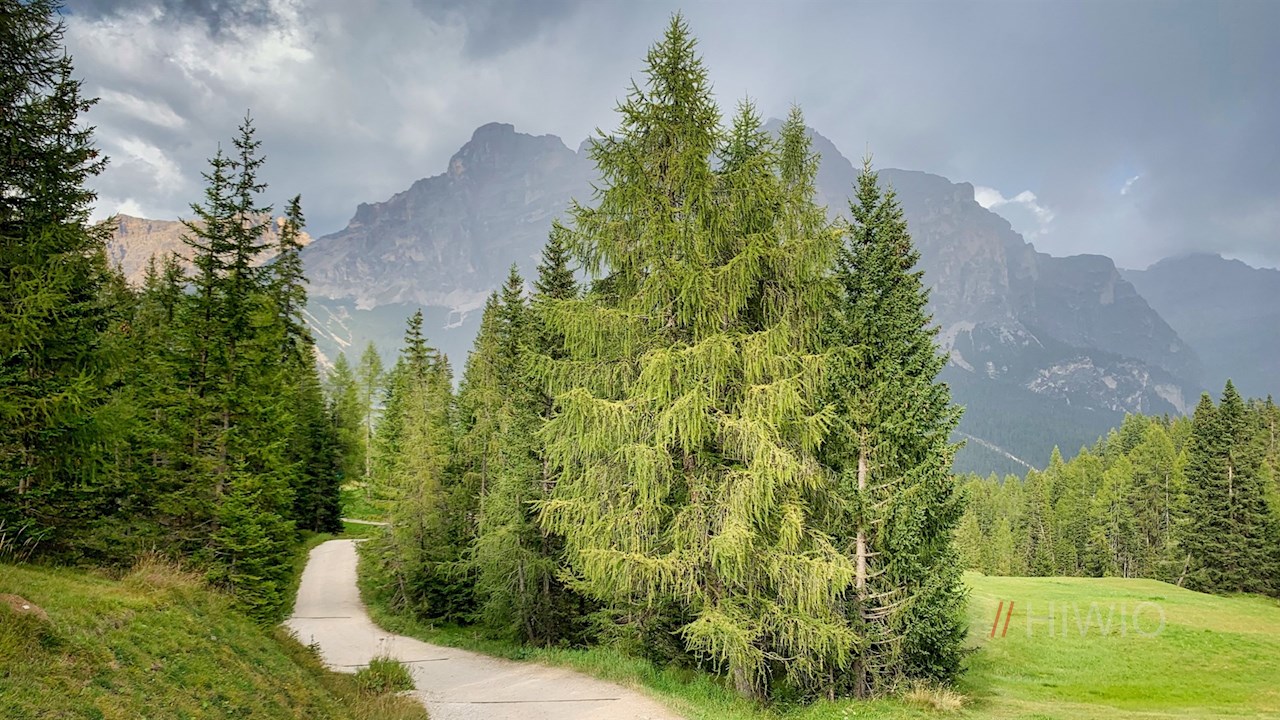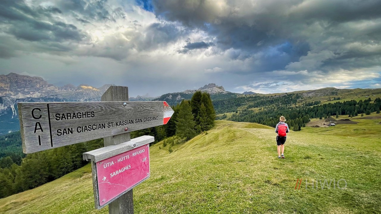 Er führt im angenehmen Abstieg durch sanft gewellte Almwiesen und öffnet dabei verträumte Ausblicke auf die Conturinesspitze, den Lagazuoi, den Sas de Stria, den Settsass, die Marmolata und den Pisciadu.