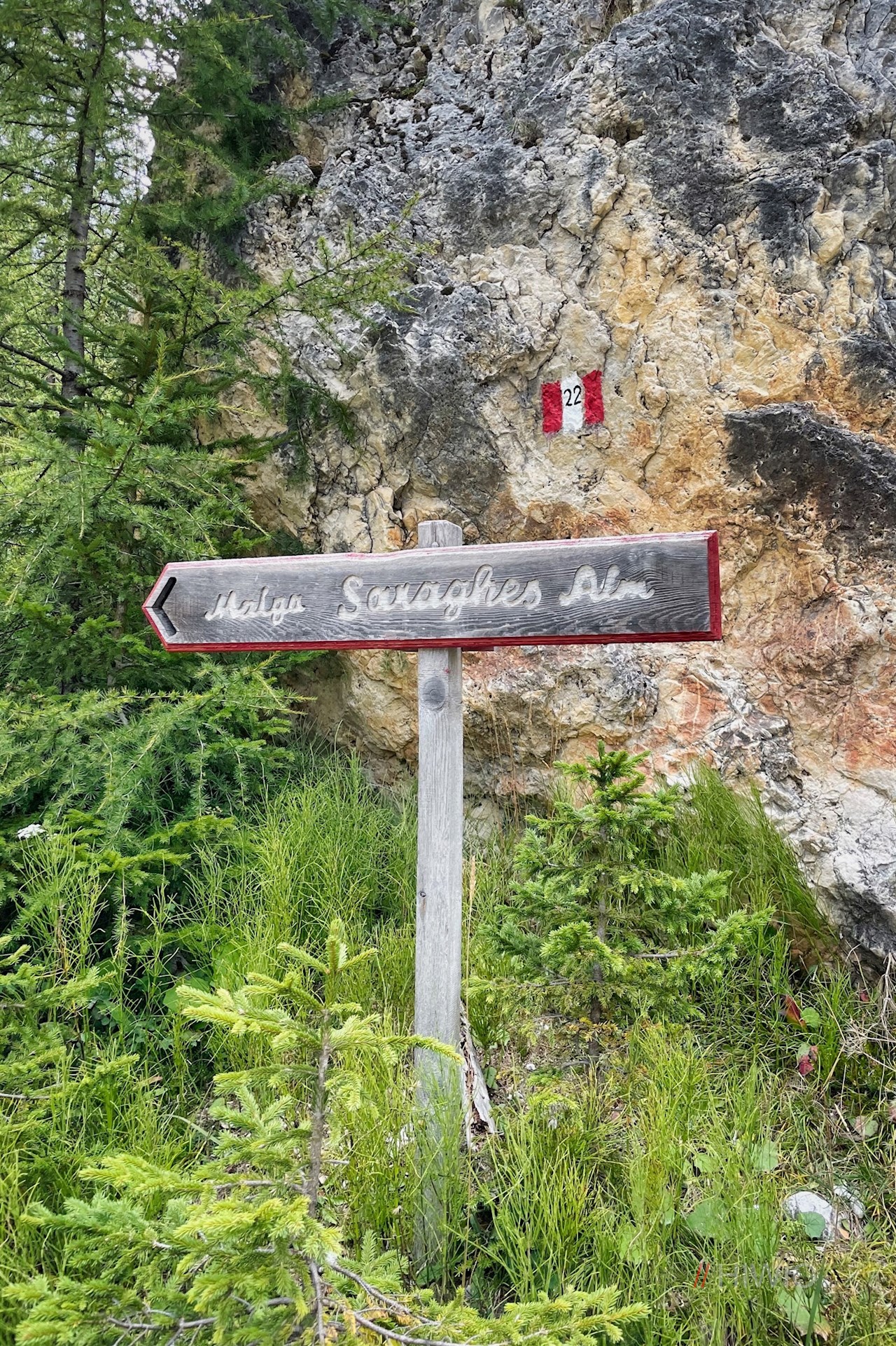 Von der Saraghes Hütte führt der breite Wanderweg Nr. 22 in einer etwa halbstündigen Wanderung zur Talstation der Seilbahn Piz Sorega zurück.