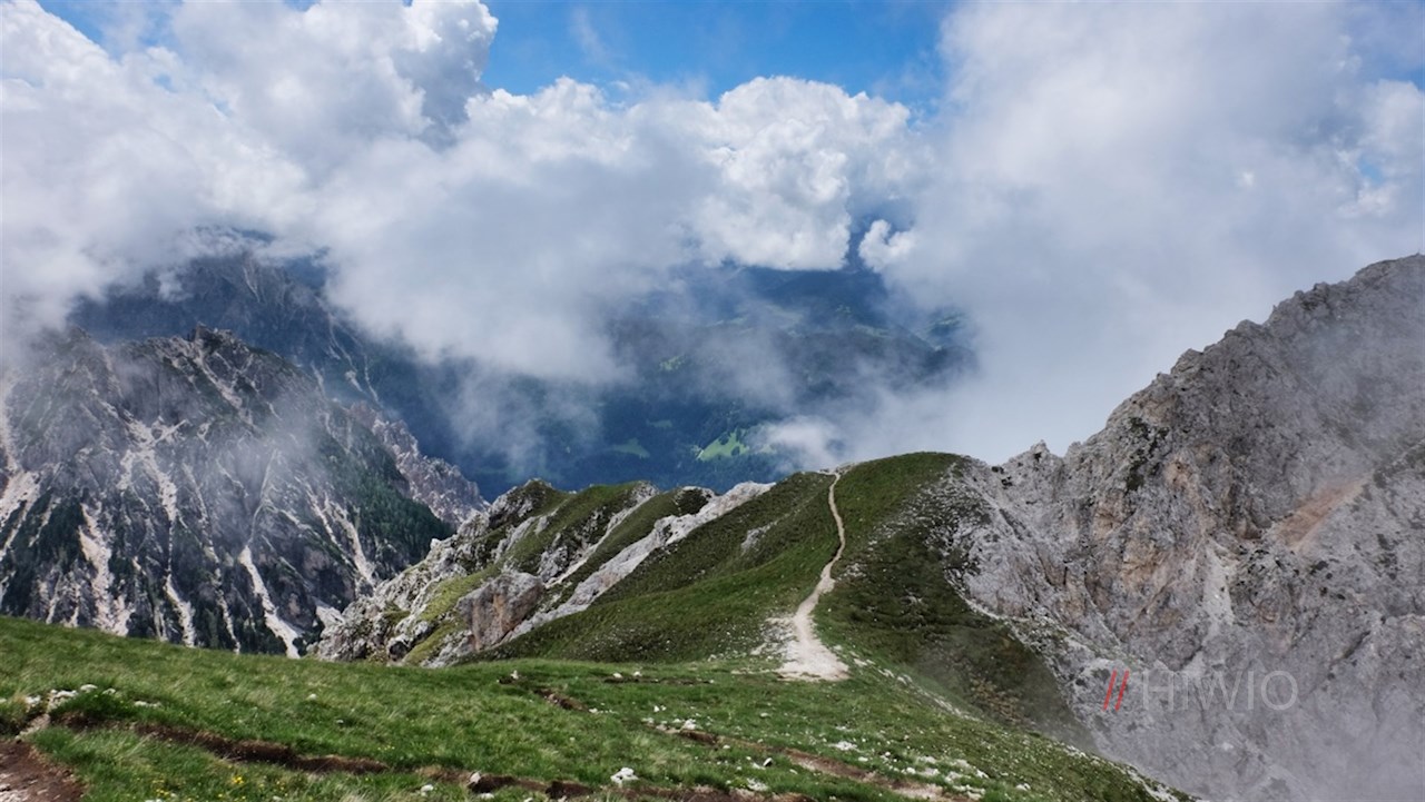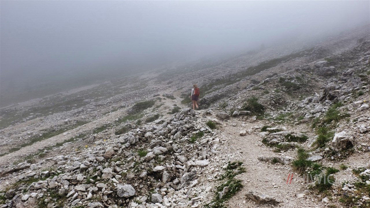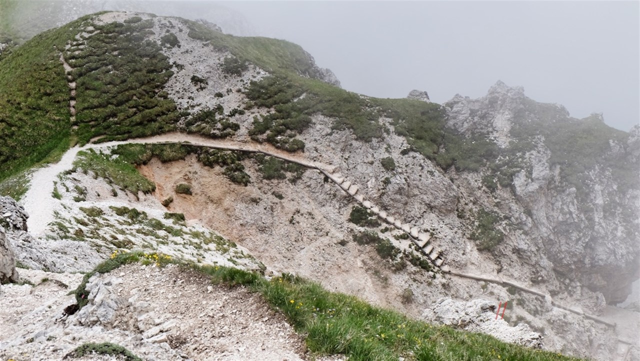 Schließlich wird der Weg schmaler und steiler und windet sich serpentinenförmig durch ein kalkweißes Schuttkar auf die Dreifingerscharte empor.