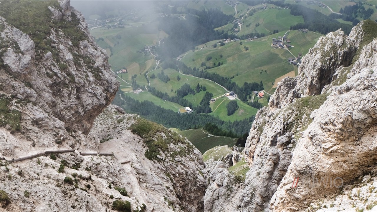 Weniger trittsichere Wanderer sollten den Rückweg vom Piz da Peres auf dem Hinweg antreten. Ansonsten empfiehlt sich der westseitige Abstieg auf dem schmalen Pfad Nr. 12, der teilweise dicht am Abgrund vorbeiführt. Eine kniffligere Passage ist mit Holzplanken versehen.