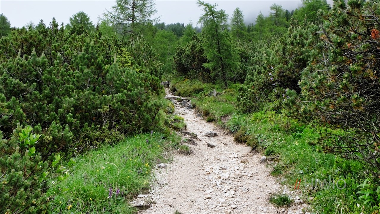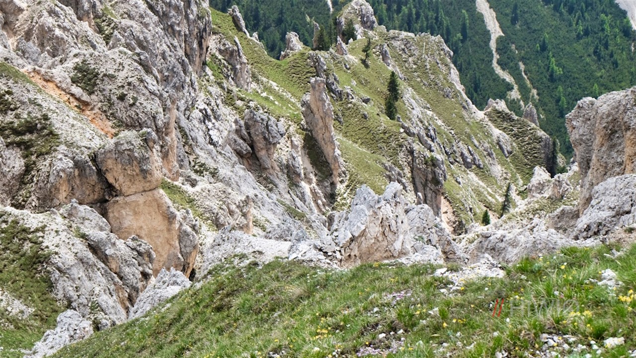 Hier folgt man dem Weg Nr. 3 in Richtung Piz da Peres bzw. Dreifingerscharte, der im anfangs gemütlichen Anstieg die lichten Waldhänge unterhalb der Felsabstürze des Piz da Peres quert.