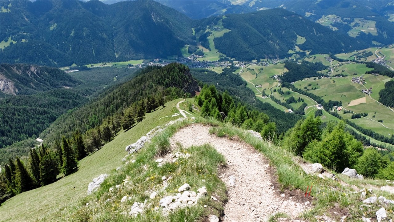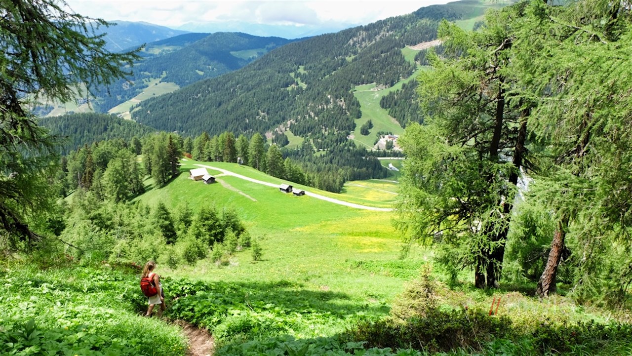 Nahe einem kreuzgeschmückten Aussichtspunkt zweigt rechts der Weg Nr. 12B ab, der über die großenteils bewaldeten Hänge an der gemütlichen Almhütte Ücia Picio Pre vorbei zum Furkelpass zurückführt.