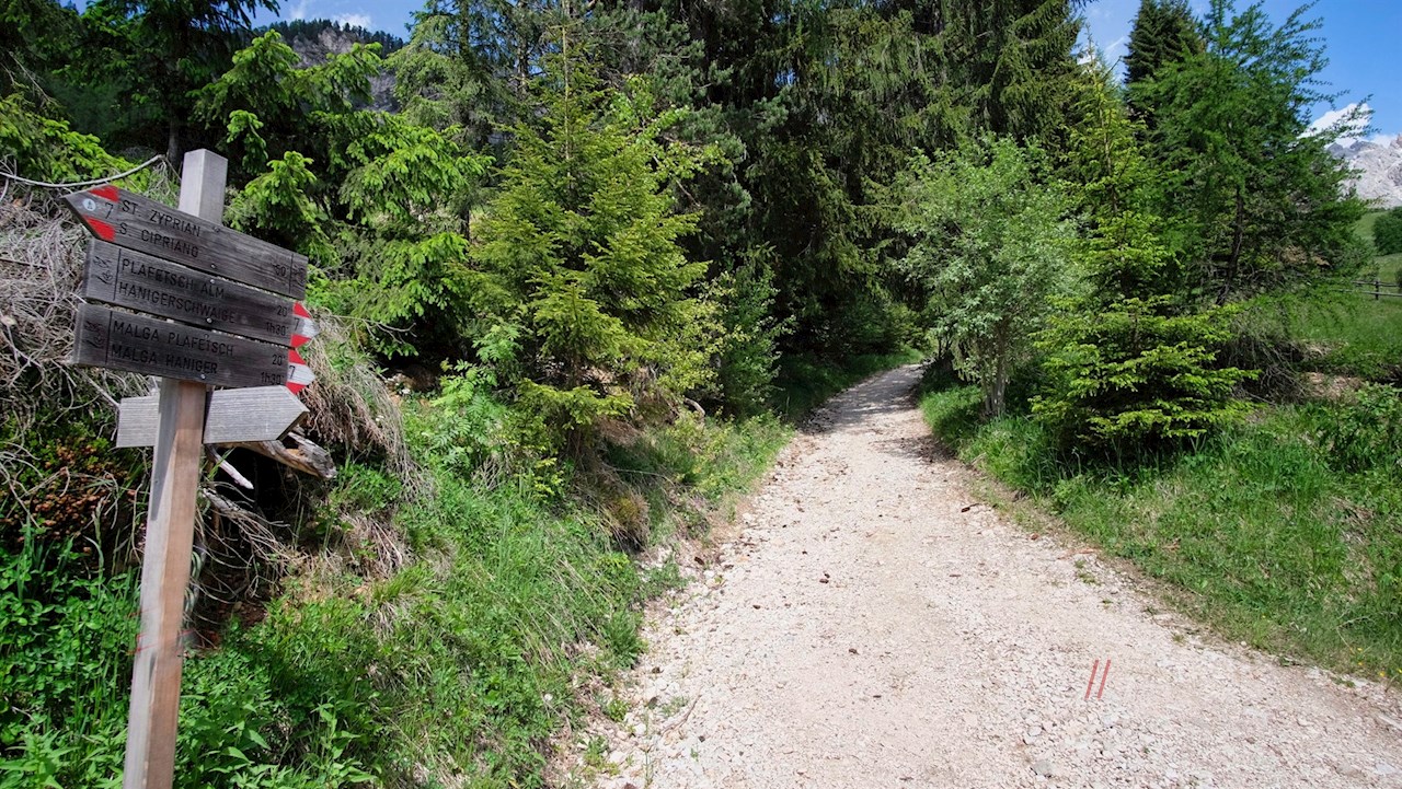 Die Wanderung zur Plafötsch Alm nimmt auf dem großen Parkplatz neben dem Hotel Zyprianerhof in St. Zyprian/Tiers ihren Anfang.