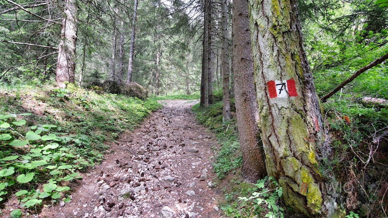 Vom Parkplatz führt der anfangs breite Wanderweg Nr. 7 im angenehmen Anstieg durch blumenfrohe Weidewiesen und schattenverheißende Waldhänge.