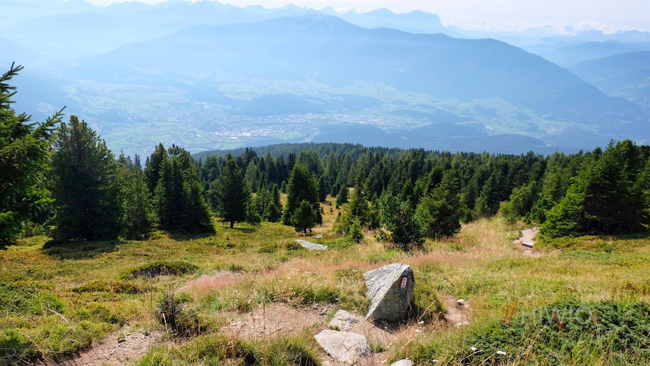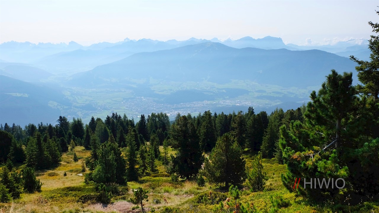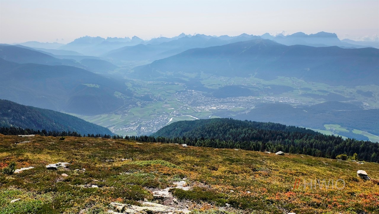 Auf der kleinen Kammhöhe öffnet sich wenig später ein malerischer Ausblick auf den Brunecker Talkessel, den Kronplatz, die gegenüberliegenden Dolomiten und die hinter uns aufragende Pfunderer Bergwelt mit der markanten Eidechsspitze, dem Mutenock, der Putzenhöhe oder der nahen Bärentalerspitze.