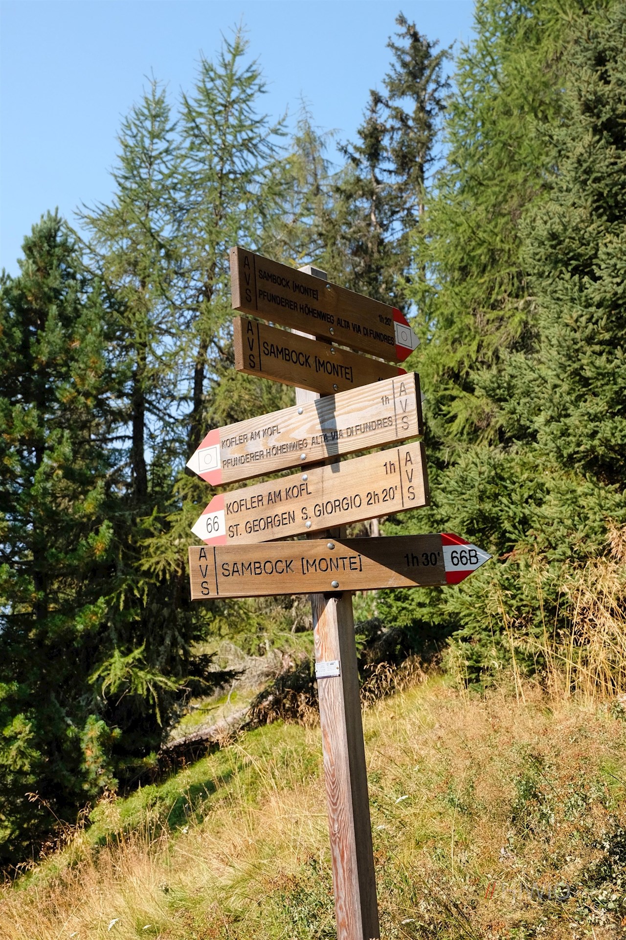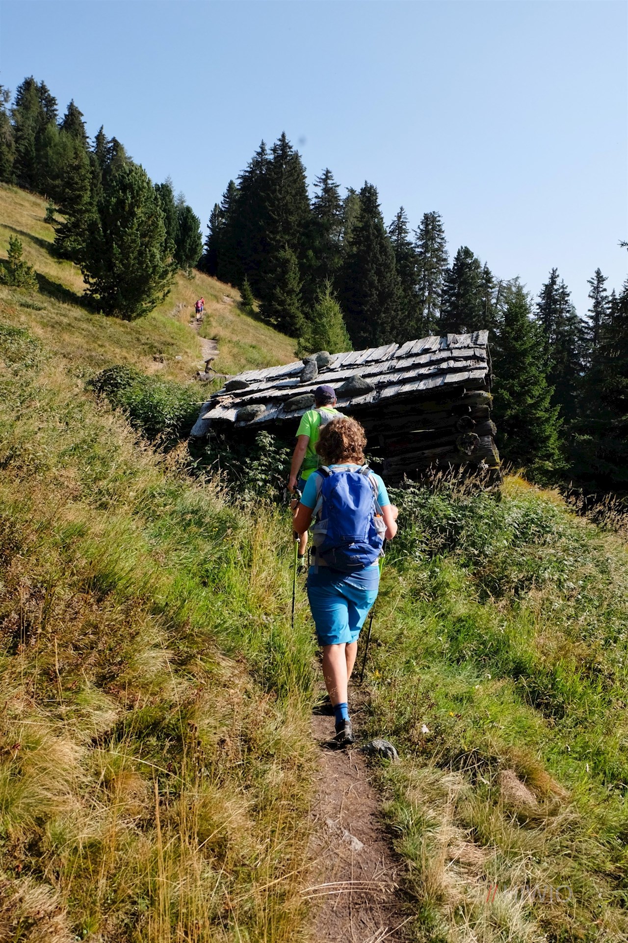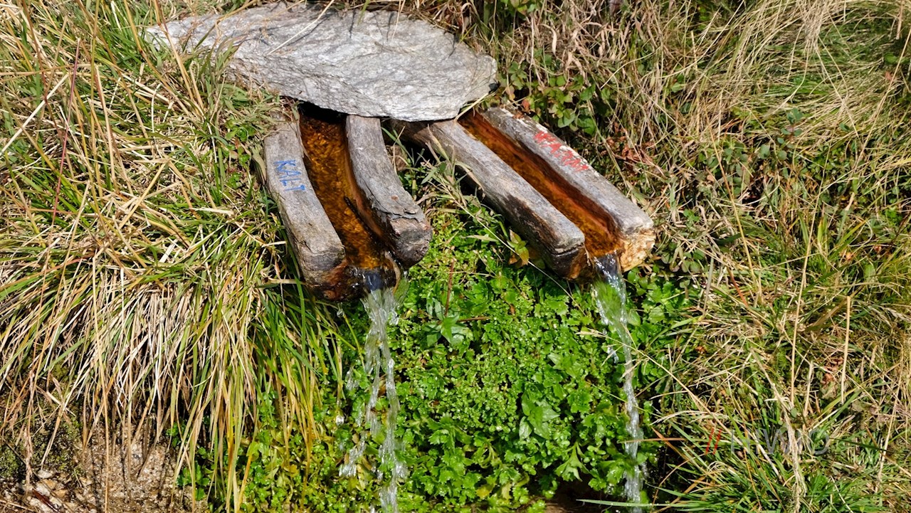 Stets der Wegnummer Nr. 66A in Richtung Sambock folgend, schlängelt sich der teils breite, teils schmale Wanderweg im angenehmen Anstieg durch Wald und aussichtsreiche Bergwiesen. Unterwegs verheißt ein kleiner Brunnen erfrischende Abkühlung.