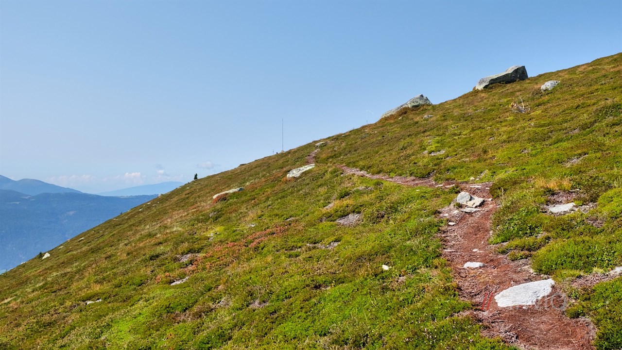 Unterhalb des grasbewachsenen Gipfelkamms des Sambock zweigt schließlich links ein kleiner (nicht ausgeschilderter) Steig zum nunmehr nahen Gipfelkreuz der Platte ab. Das elegante kleine Kreuz aus hellem Metall ist zwar von hier aus noch nicht zu sehen, doch weist eine dicht daneben stehende Holzstange den Weg.