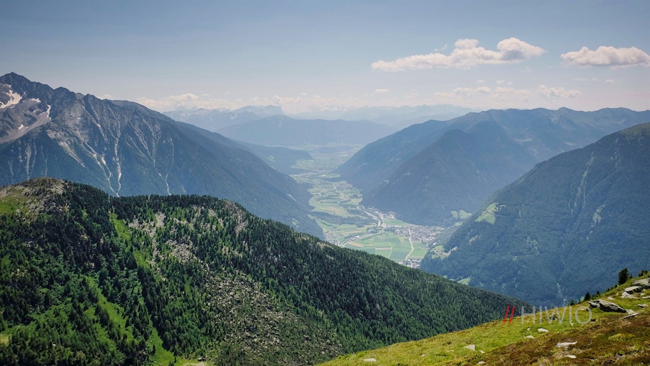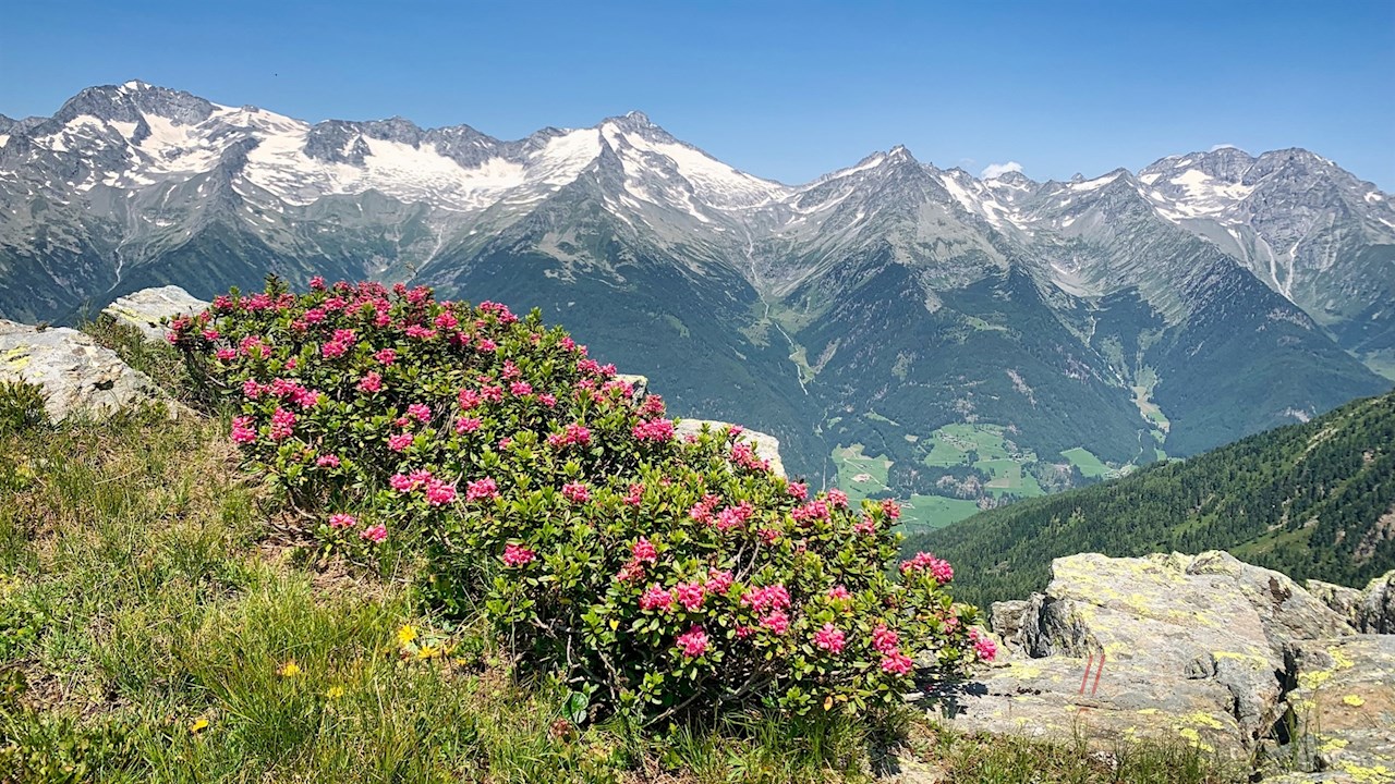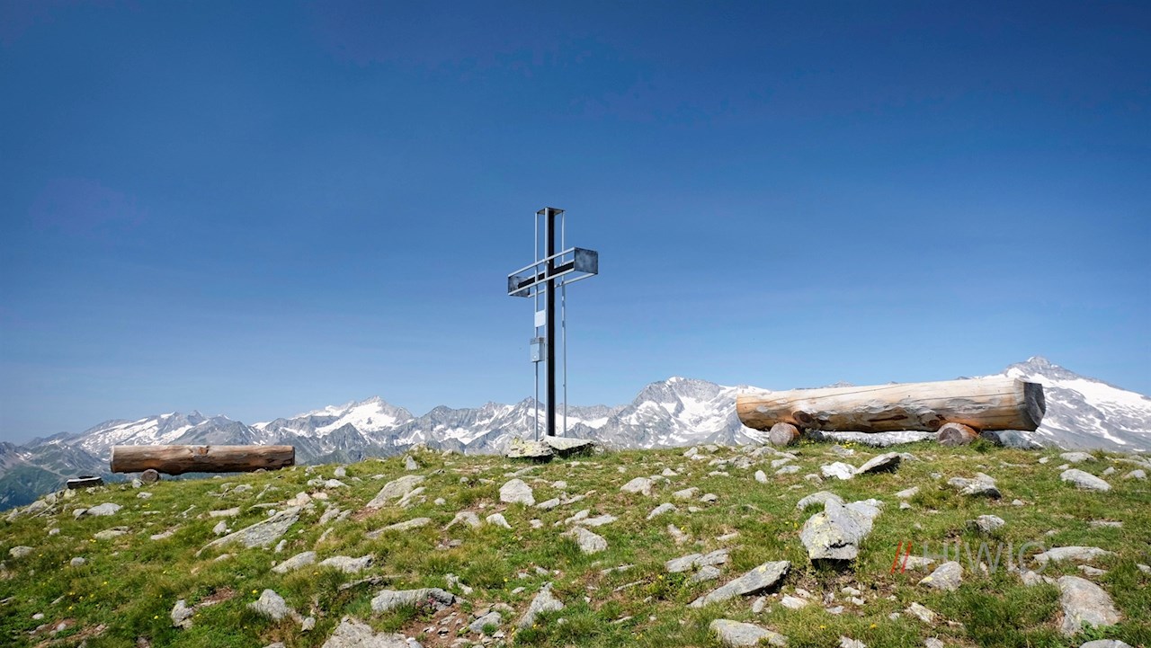 Neben dem anmutigen Gipfelkreuz des Pojenspitz öffnet sich wenig später ein Ausblick, der seinesgleichen sucht: Der Blick schweift von der imposanten Gletscherwelt um den Schwarzenstein über den nahen Moosstock bis hin zu den fernen Dolomiten. Zu unseren Füßen erstrecken sich indes das Puster- und das Ahrntal. Gipfelbänke laden zum Verweilen und Genießen dieser malerischen Idylle ein.