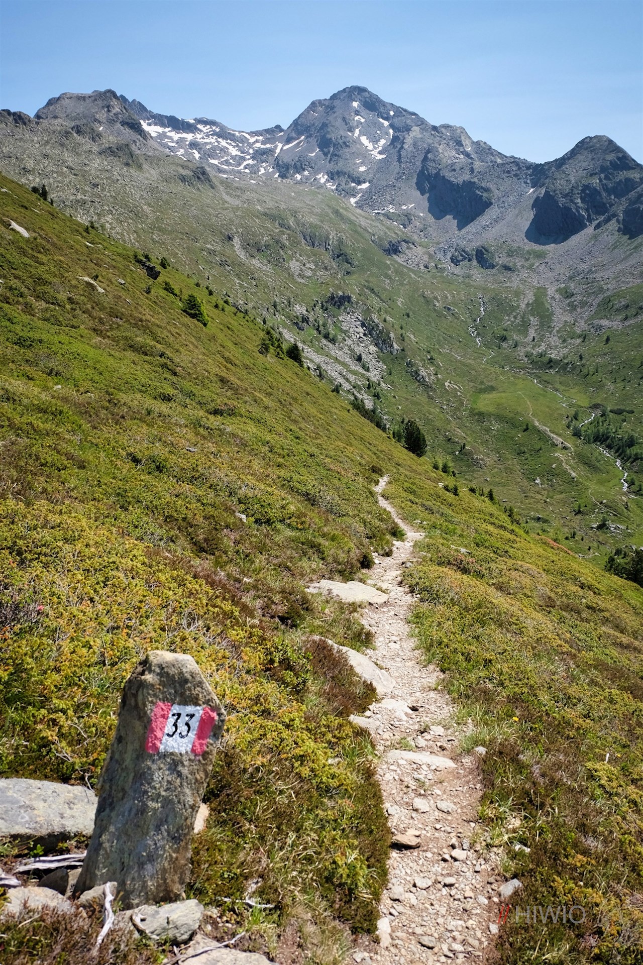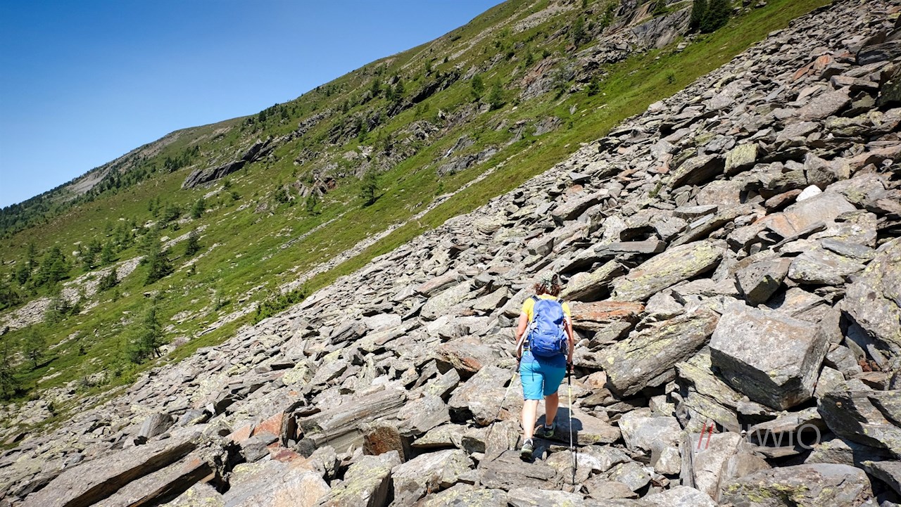Hinter den steinernen Almhütten geht die Wanderung in den nunmehr schmalen, in Richtung Steinerholm führenden Steig Nr. 33 über. Er windet sich vor der Kulisse der ringsum aufstrebenden Bergwelt über die friedvollen, teils steinbeschlagenen Hänge auf einen aussichtsreichen Kamm.