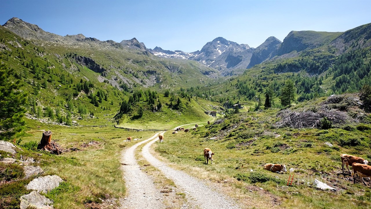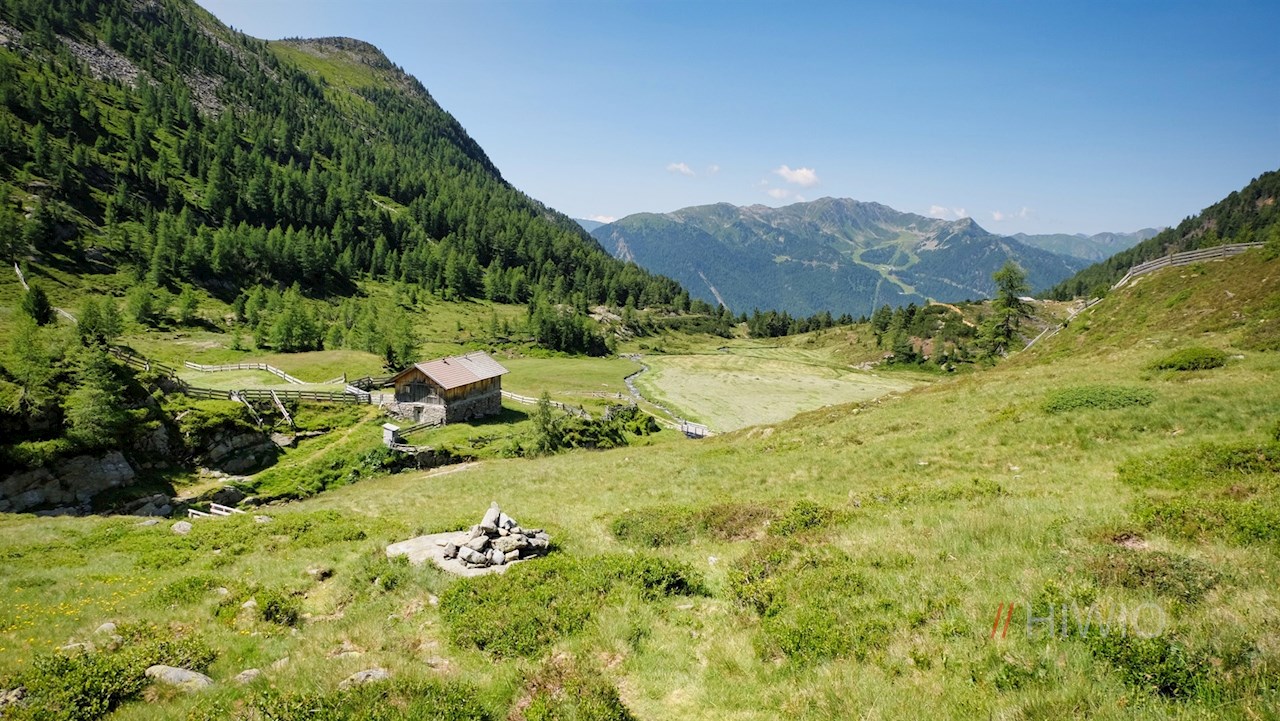 Vom Parkplatz schlängelt sich der breite, anfangs recht steile Wanderweg Nr. 33 durch Wald und abgeschiedene Weidewiesen zu den idyllischen, am Fuße des imposanten Moosstock gelegenen Pojer Almen.