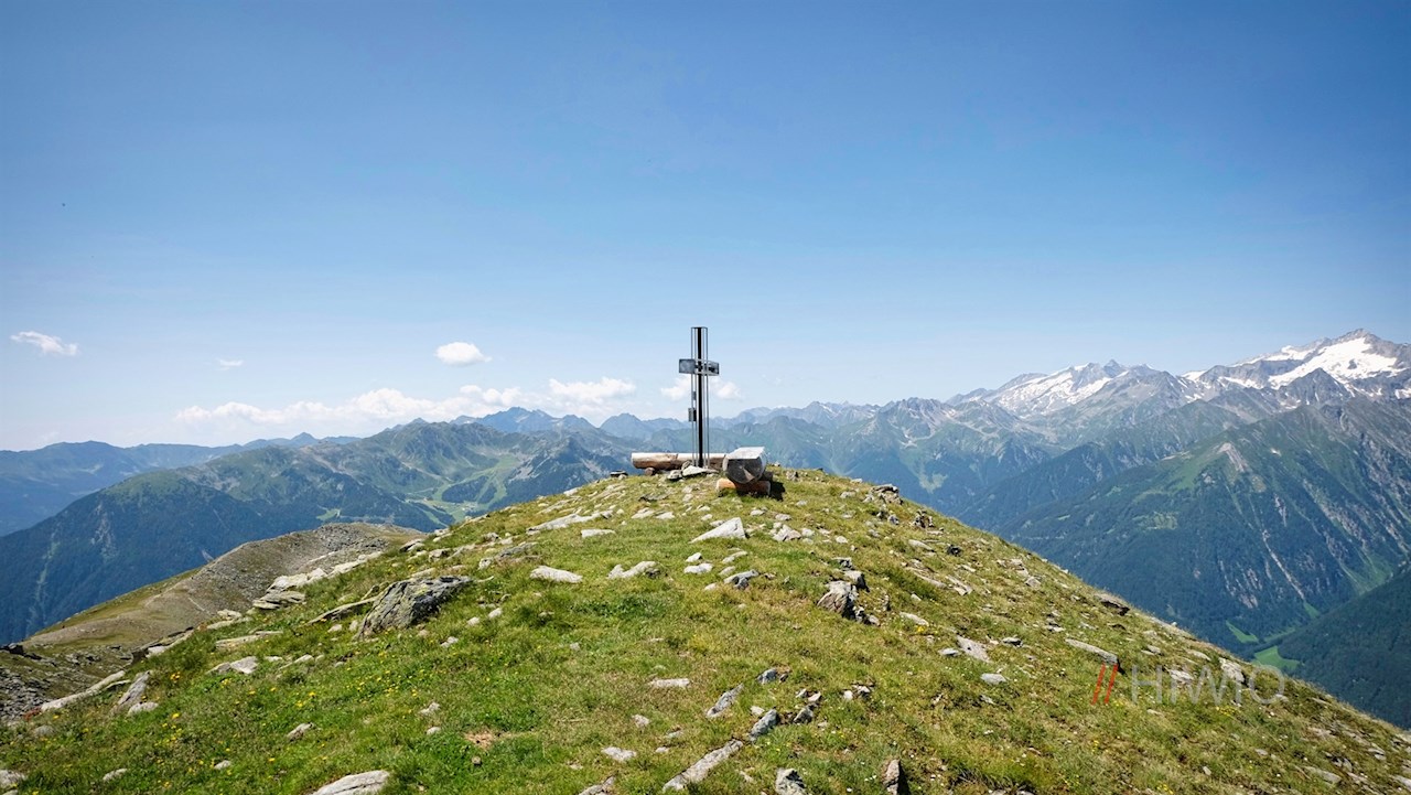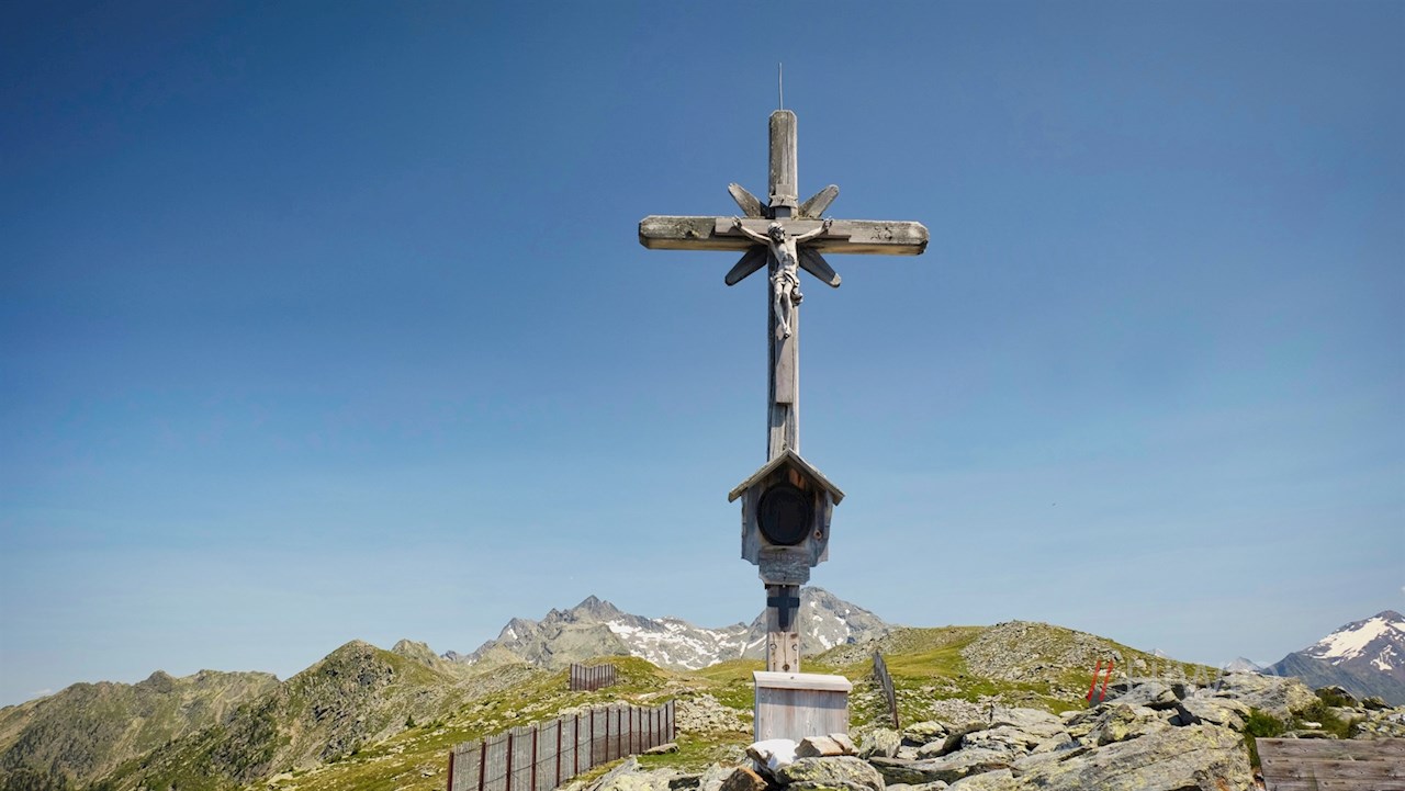 Hier gerät neben der hochaufragenden Gletscherwelt des Ahrntals auch der kreuzgeschmückte Pojenspitz erstmals in unser Blickfeld. Wenngleich er selbst nicht ausgeschildert ist, ist der Anstieg daher nicht zu verfehlen: Dem rechts abzweigenden Steig folgend, gelangt man in wenigen Minuten auf diesen aussichtsreichen Gipfel.