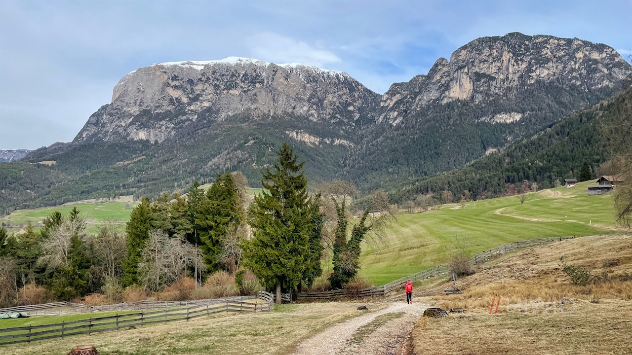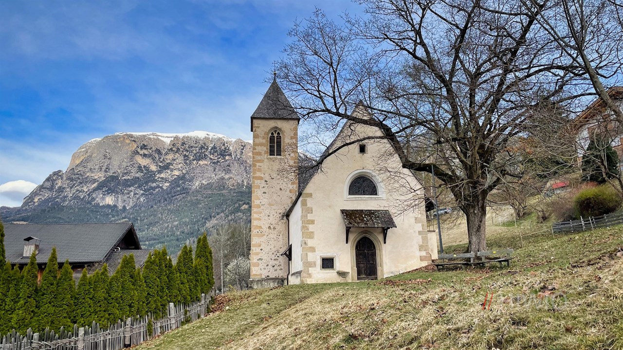 Neben der dahinterliegenden Dorfkirche zweigt der sanft ansteigende, von schlichten Kreuzwegstationen gesäumte Weg Nr. 7 in Richtung Schnaggenkreuz ab. Er führt vor der Kulisse des imposanten Schlern durch blumenfrohe Wiesen zur nächsten Weggabelung.