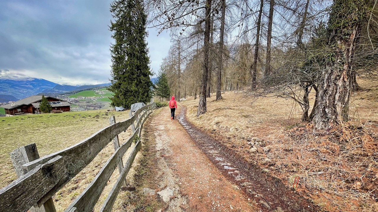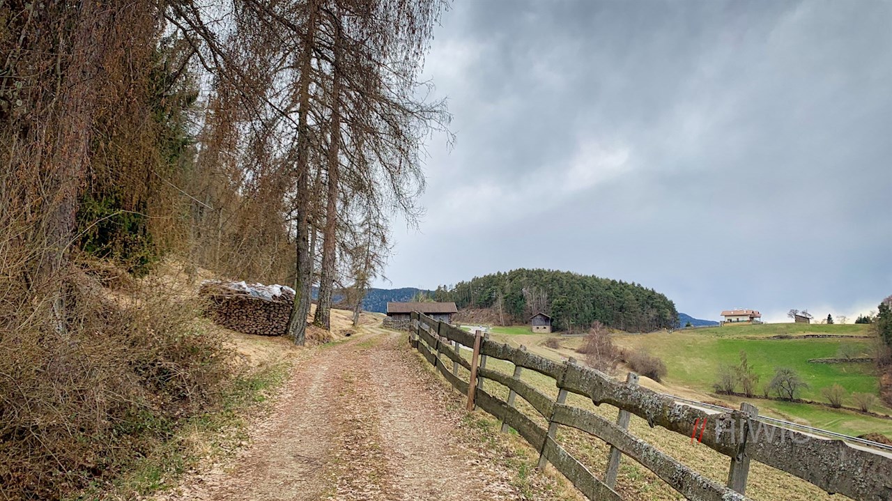 Hier weist das Wanderschild Nr. 6A den Weg nach Völser Aicha. Er folgt zunächst ein kurzes Stück der Straße und schlängelt sich dann durch aussichtsreiche Wiesen und schattige Waldstücke. Unterwegs öffnen sich schöne Ausblicke auf den benachbarten Ritten und die Unterinner Erdpyramiden.
