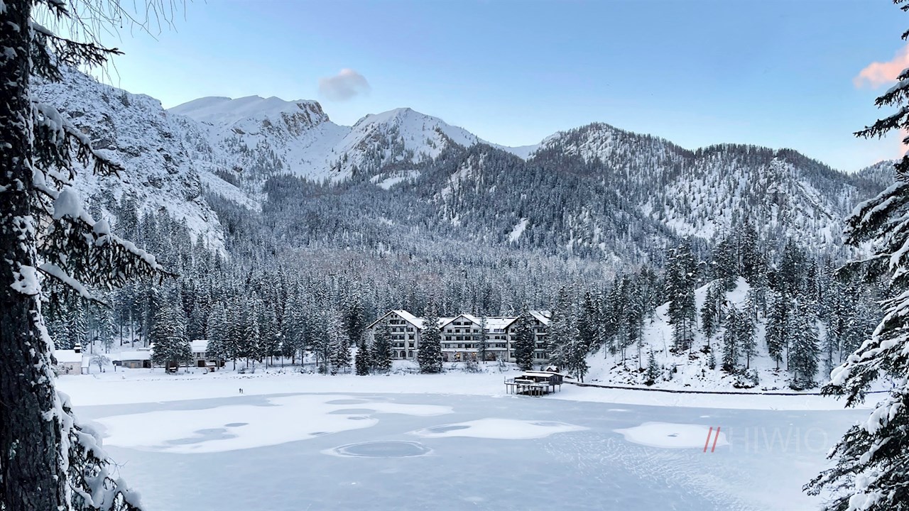 Die Winterwanderung um den Pragser Wildsee beginnt am geschichtsträchtigen Hotel Pragser Wildsee, das man mit dem Auto oder den öffentlichen Bussen anfahren kann.