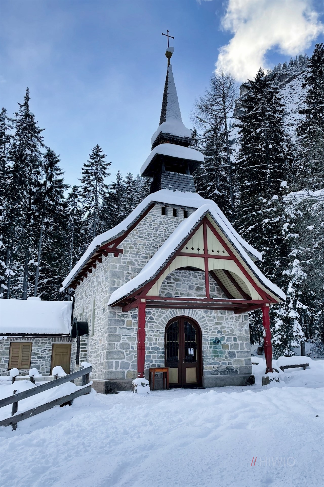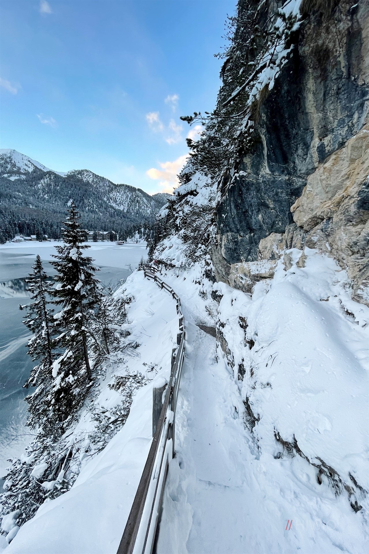 Schließlich erreicht man das vielfotografierte Bootshaus am Nordufer des Pragser Wildsees; während sich hier im Sommer nostalgische Ruderboote wie zu einer Perlenkette aneinanderreihen, liegt das kleine Häuschen im Winter verwaist da.
