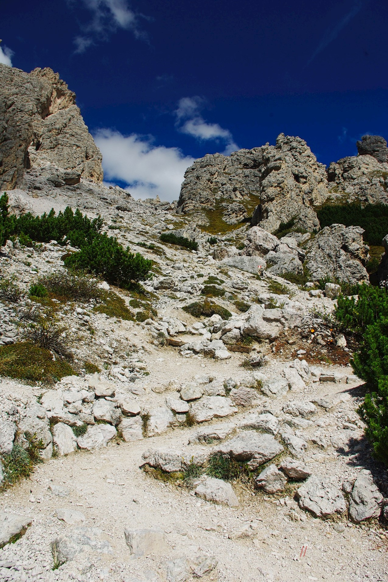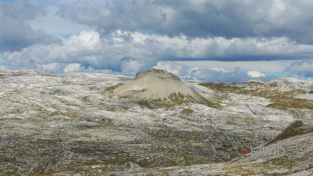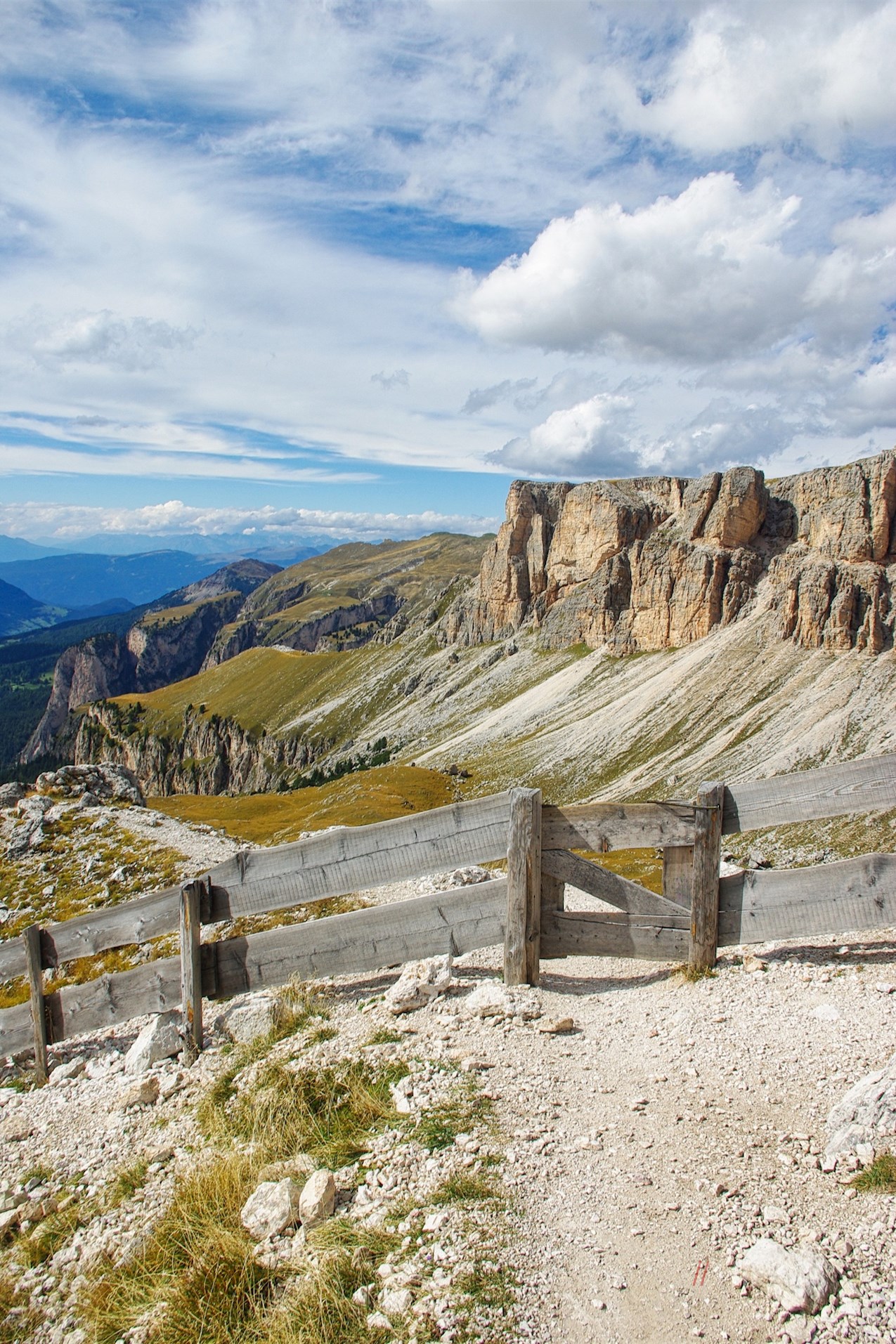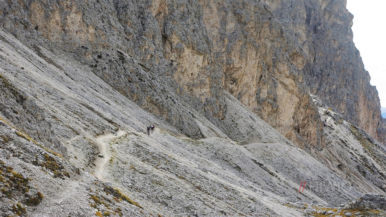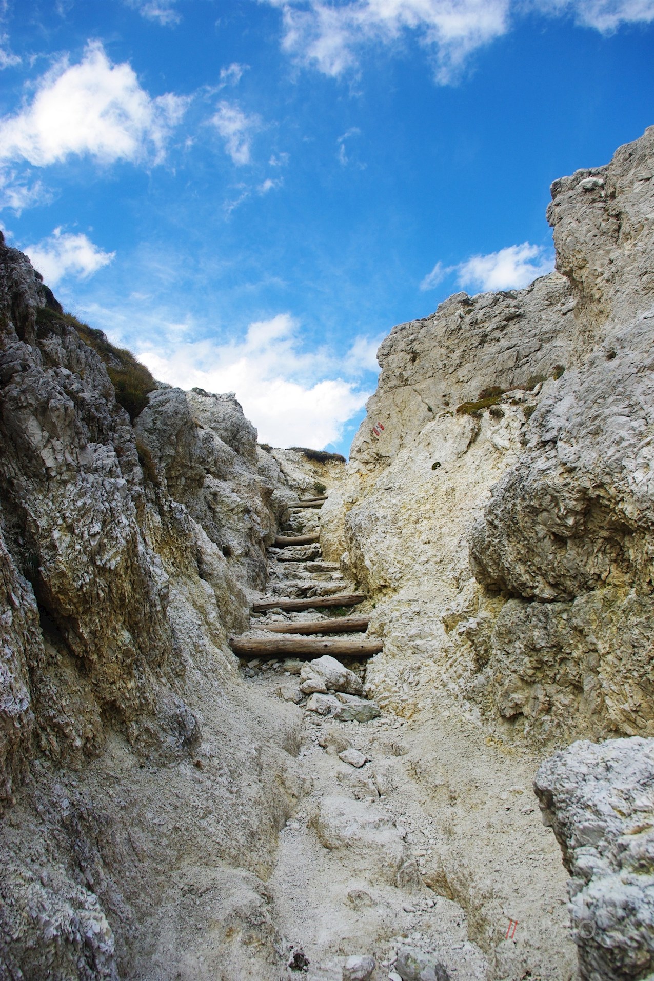 Nach wie vor die Wegnummer 2 beibehaltend, folgt man nun dem leicht abfallenden Steig, der wenig später auf das kreuzgeschmückte Crespeina-Joch ansteigt. Auf 2.528 m Höhe erschließt sich hier ein weiter Blick auf die einer Mondlandschaft nicht unähnlichen Puezhochfläche.