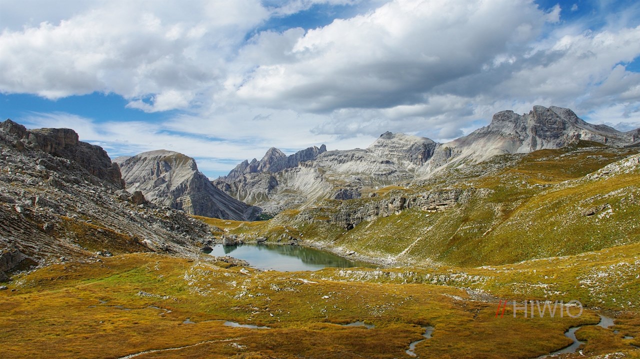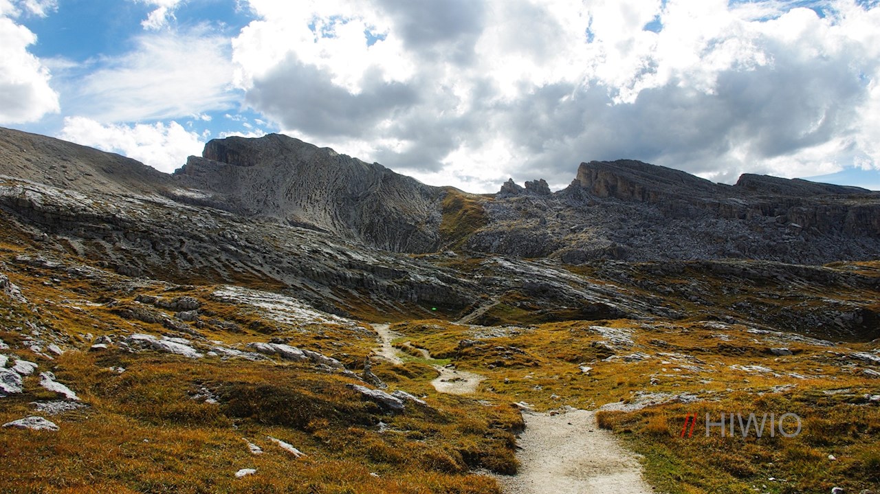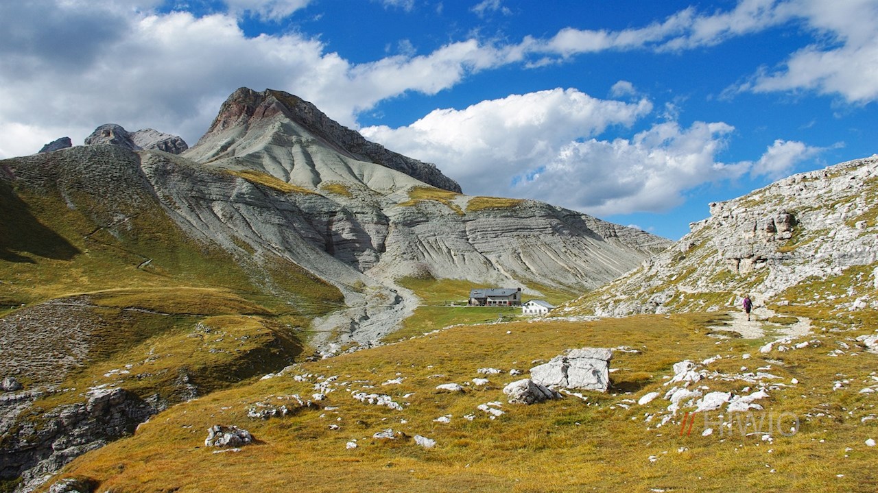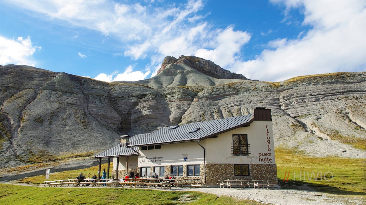 Nach einem beinahe ebenen Wegestück durch diese unwirklich anmutende Berglandschaft steigt der Wanderweg über das Ciampeijoch zur Puezhütte an. Inmitten einer grünen Bergwiese am Fuße der Puezspitze verlockt sie zur genüsslichen Zwischenrast vor der atemberaubende Kulisse des Langentals und der ringsum aufragenden Dolomiten.