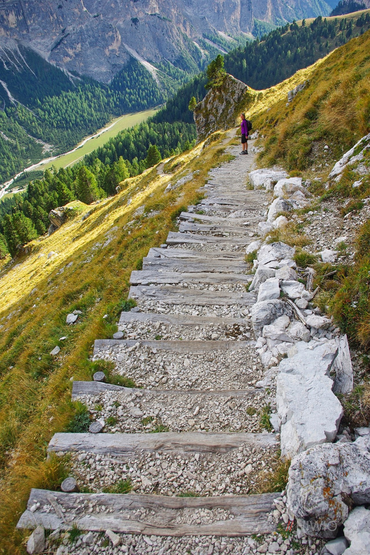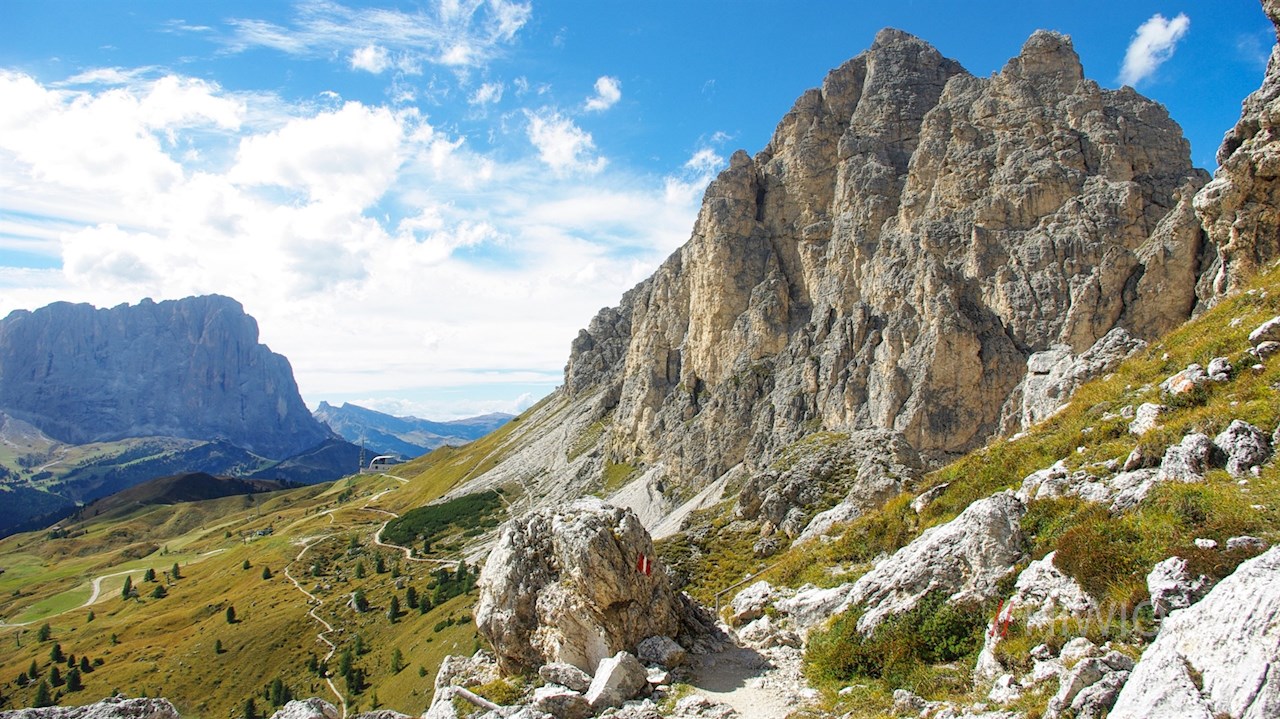 Die Wanderung zur Puezhütte nimmt an der Talstation der Dantercepies Seilbahn in Wolkenstein ihren Anfang, mit der man einfach und bequem auf das zwischen dem Grödnertal und dem Gadertal eingeschnittene Grödner Joch hochfährt. Oben angekommen folgt man dem sanften Weg Nr. 12A zur nahen Jimmy Hütte.