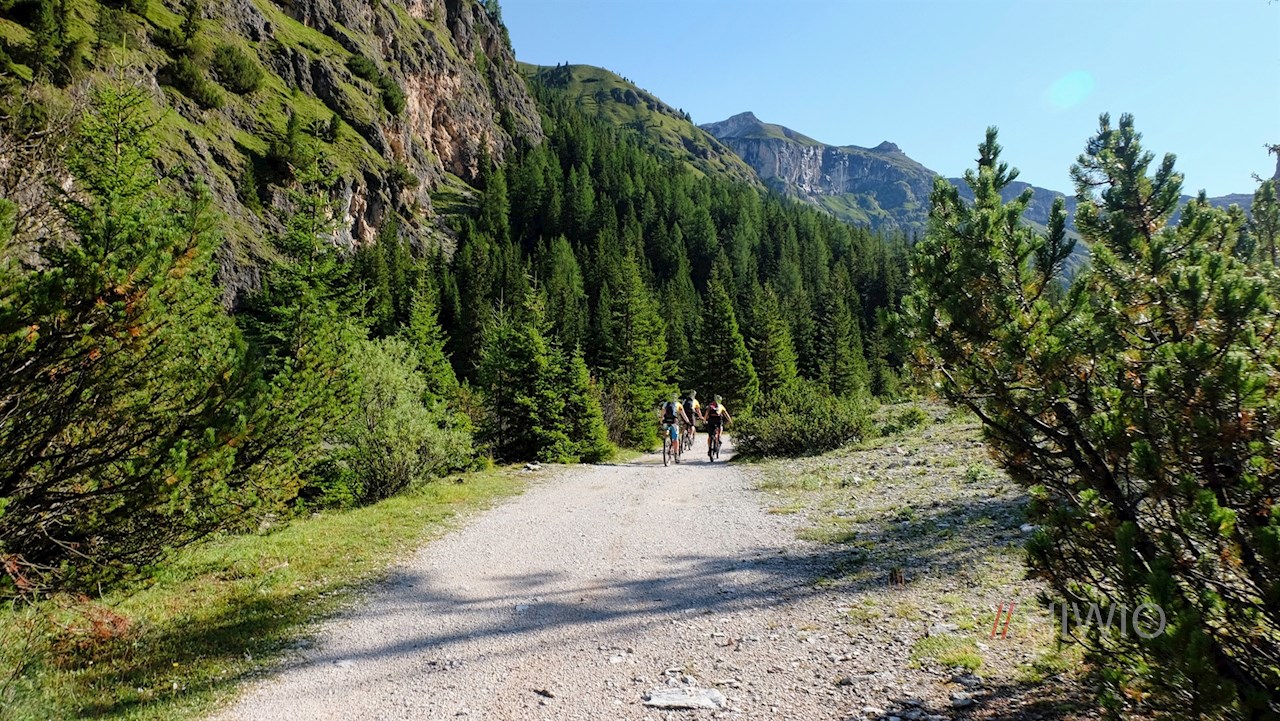 Hier schlägt man den anfangs nahezu ebenen Wanderweg Nr. 14 in Richtung Puezhütte ein, der sich durch das ausgedehnte, teils grasbewachsene, teils baumbestandene Langental schlängelt. Der von imposanten Felswänden umrahmte Weg wird vom sanft plätschernden Talbächlein begleitet, das mitunter im Erdreich verschwindet, um dann wieder aufzutauchen.