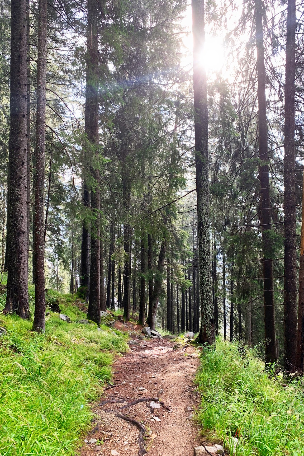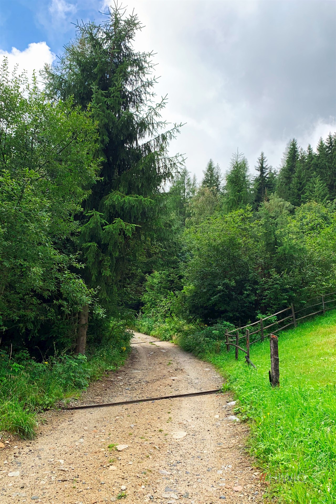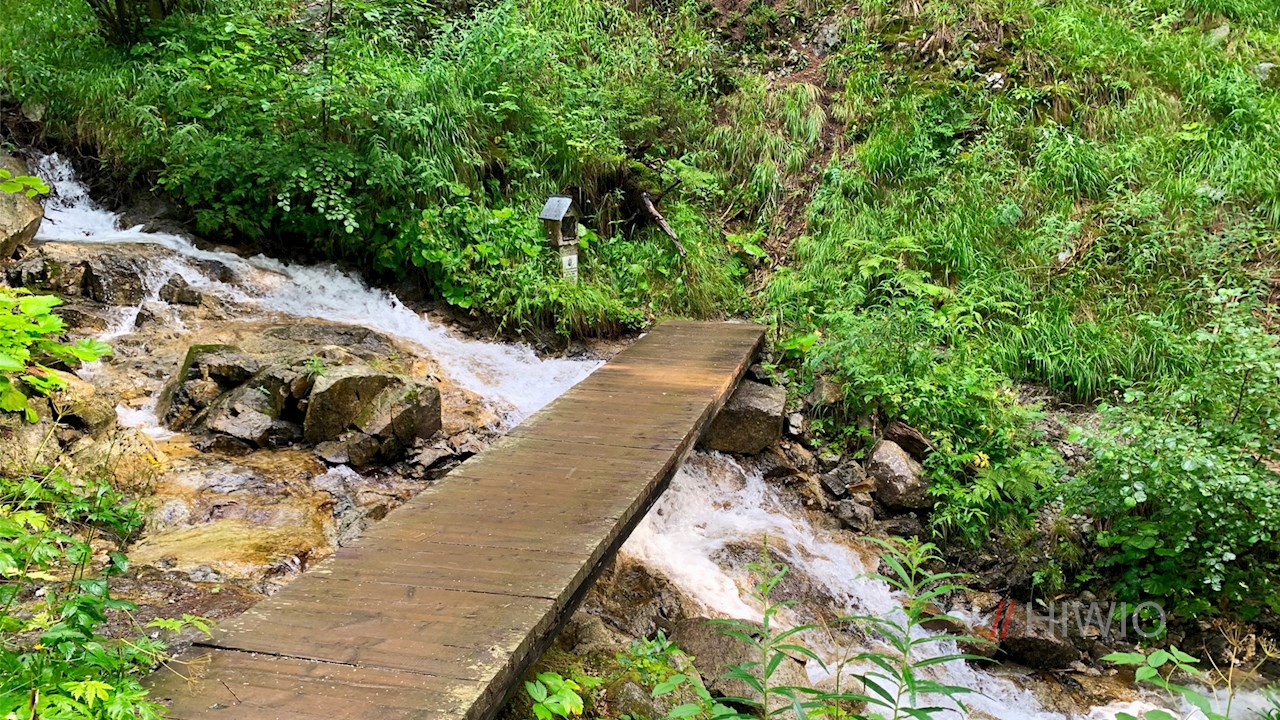 Etwas oberhalb des Parkplatzes zweigt am linken Wegesrand der Wanderweg Nr. 14 in Richtung Puntleider Seealm ab. Er zieht sich im steten, teilweise recht steilen Anstieg durch den schattenverheißenden Wald und überquert dabei den kleinen Berglerbach.