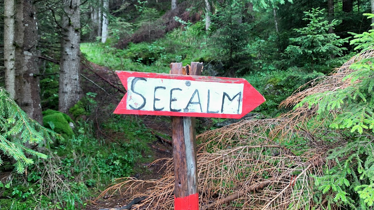 Alternativ zum hier vorgeschlagenen Anstieg über den ziemlich steilen Waldsteig ist die Puntleider Seealm auch auf dem breiten, sanfter ansteigenden Forstweg zu erreichen, der oberhalb des Wanderparkplatzes rechts abzweigt.