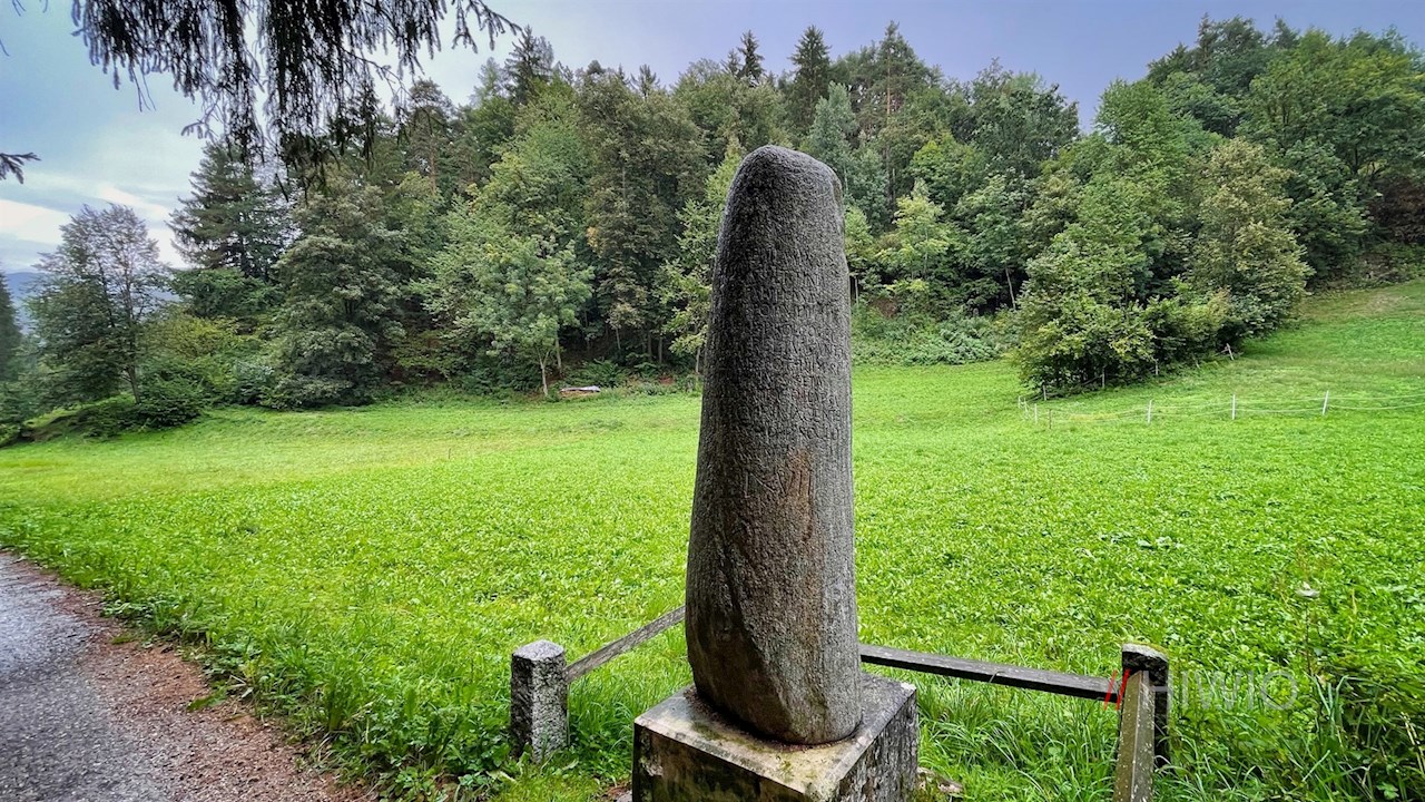 Wir aber folgen dem rechts abzweigenden Sträßchen „Am Römerstein“, das durch den Wald zum Ehrenburger Meilenstein führt. Der rund 2 m hohe, aus Quarzphyllit bestehende Markstein wurde im Jahre 1928 am Fuße des westlich von Ehrenburg gelegenen Hinterbühls entdeckt und zählt heute zu den besterhaltenen römischen Meilensteinen. In römischer Zeit gab er die Entfernung zur antiken Römerstadt Aguntum an. Vor Ort gibt eine Infotafel Aufschluss über seine Beschaffenheit und Inschrift.