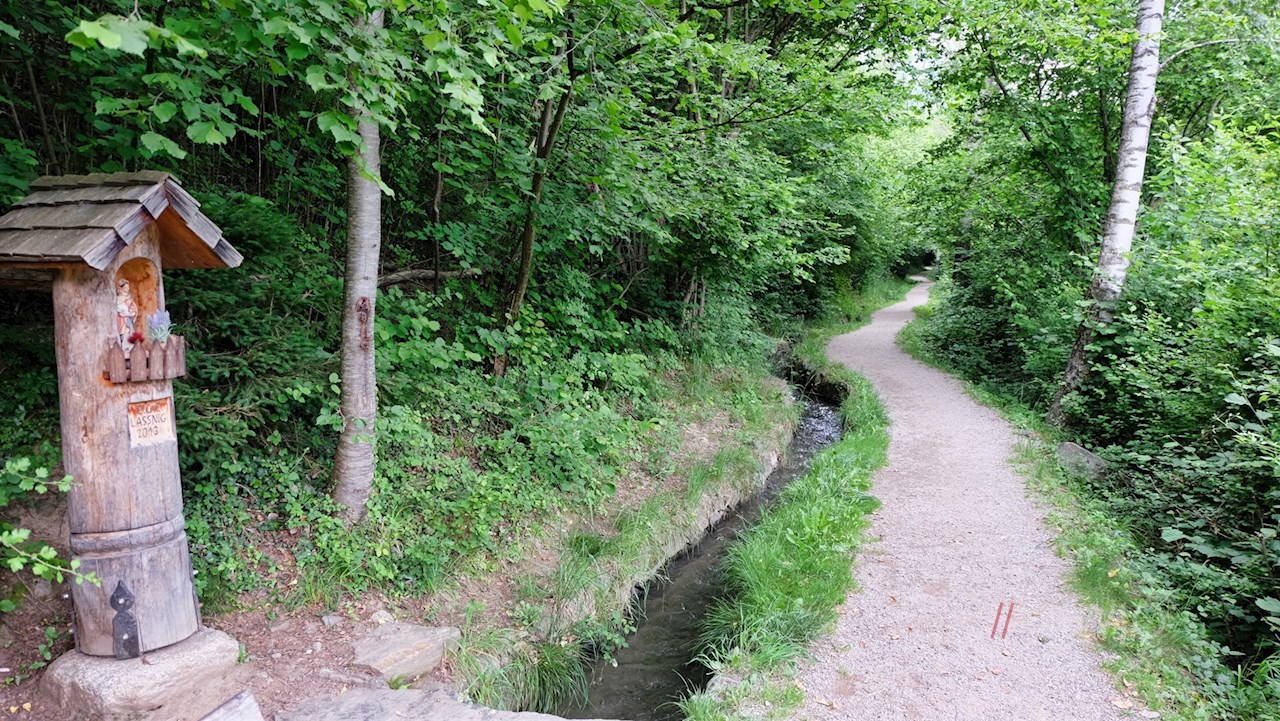 Der Rablander Waalweg zählt zu den kürzesten, zugleich aber auch friedvollsten Waalwegen um Meran. Mit seinem kostbaren Nass versorgt der plätschernde Rablander Waal noch heute die umliegenden Obstwiesen.