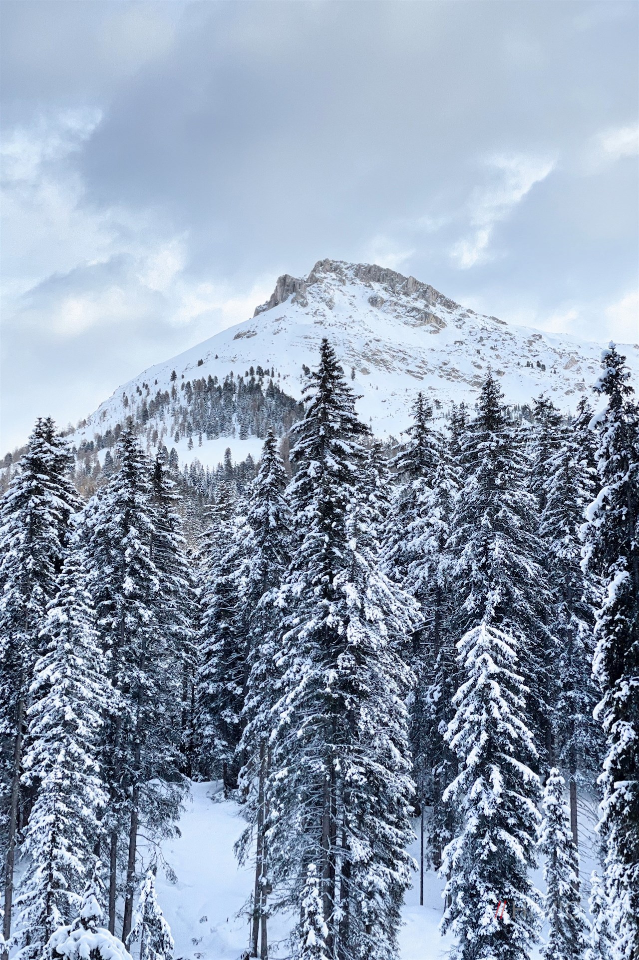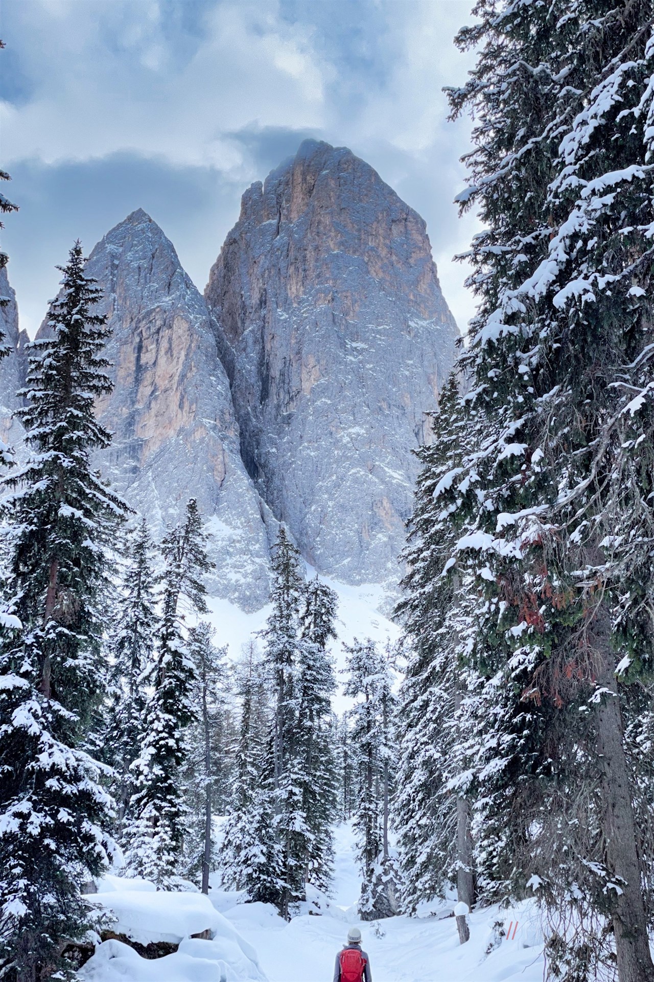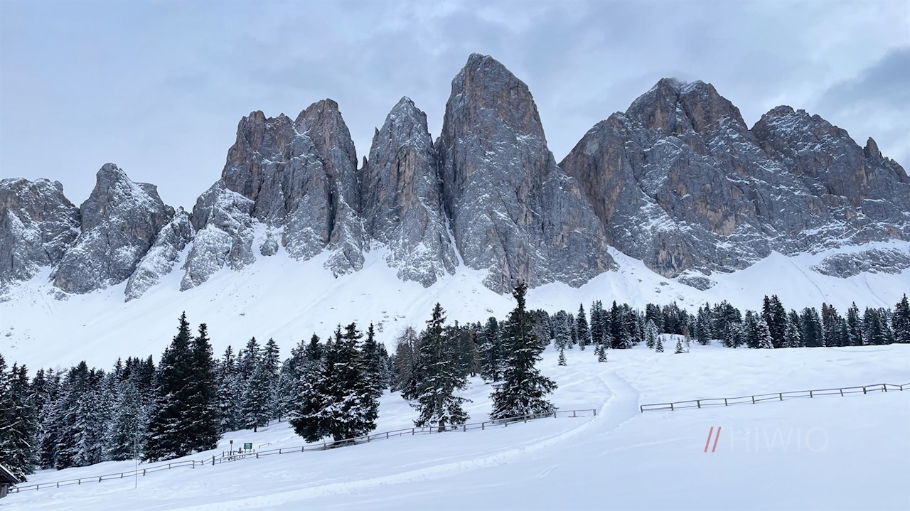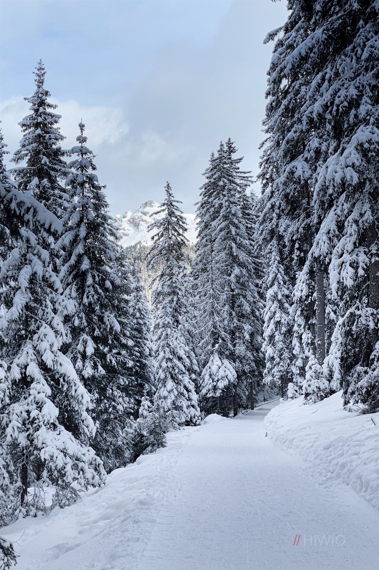 Vor der Kulisse der immer wieder zwischen den weißen Baumwipfeln hervorlugenden Geislerspitzen zieht er sich im großenteils sanften Anstieg zur Glatschalm hoch.
