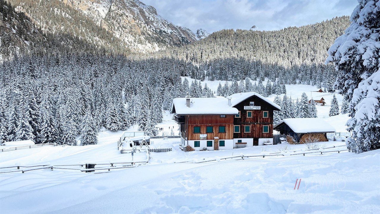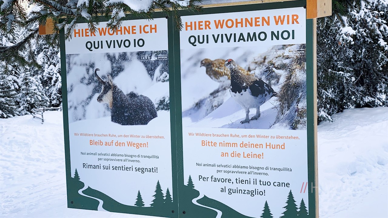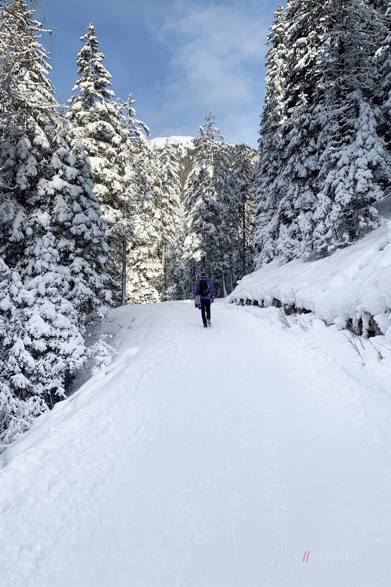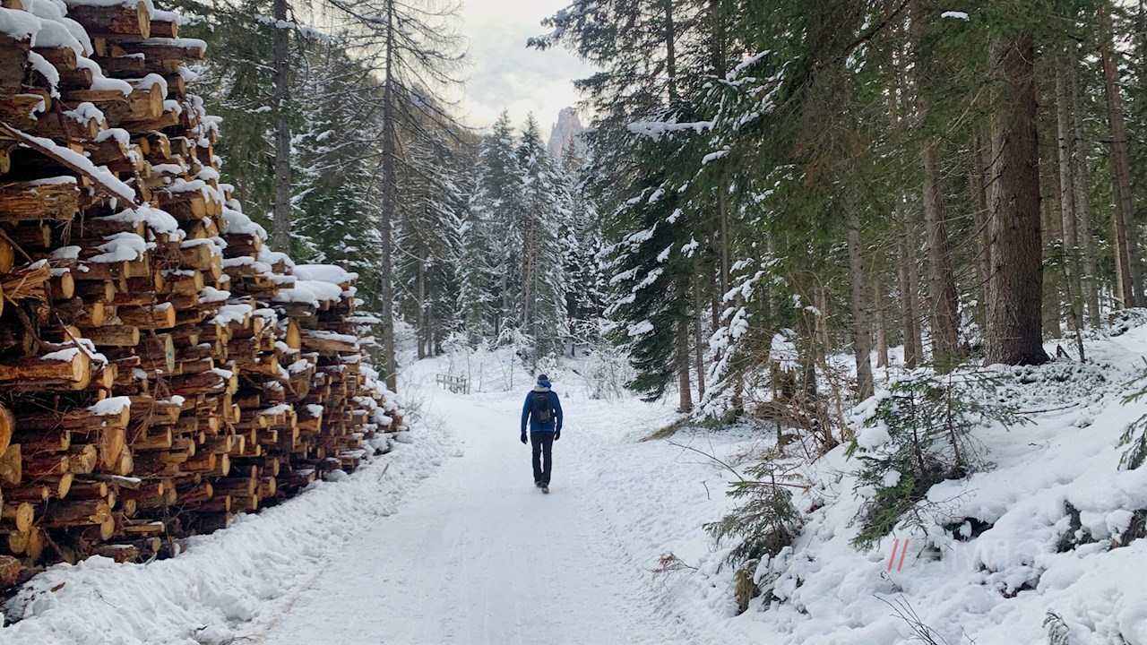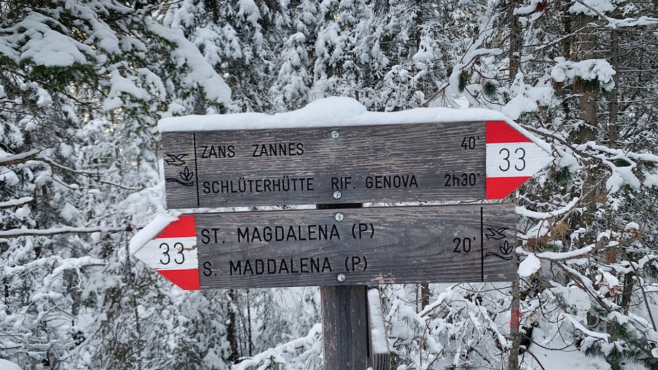 Dem Wanderschild Nr. 33 in Richtung Glatschalm folgend, taucht der gebahnte Wanderweg alsbald in den zumeist tiefverschneiten Wald ein, durch den er sich im angenehmen, vom Glucksen des Villnösser Bachs begleiteten Anstieg nach Zans schlängelt.