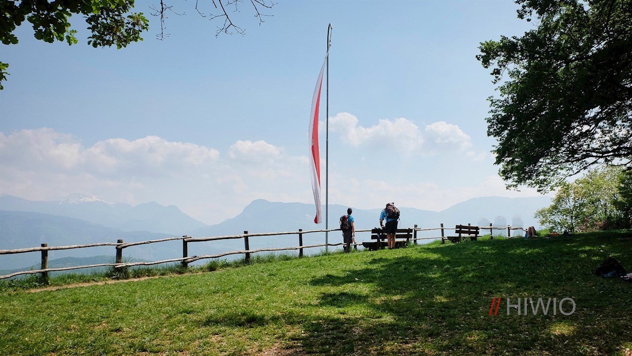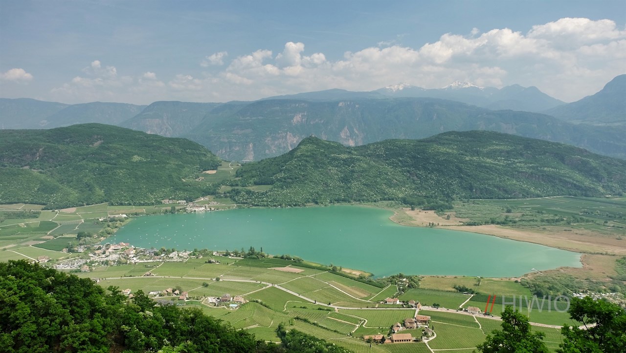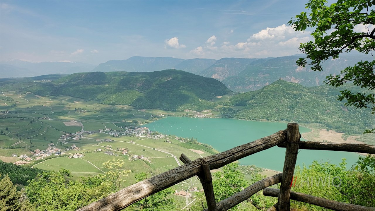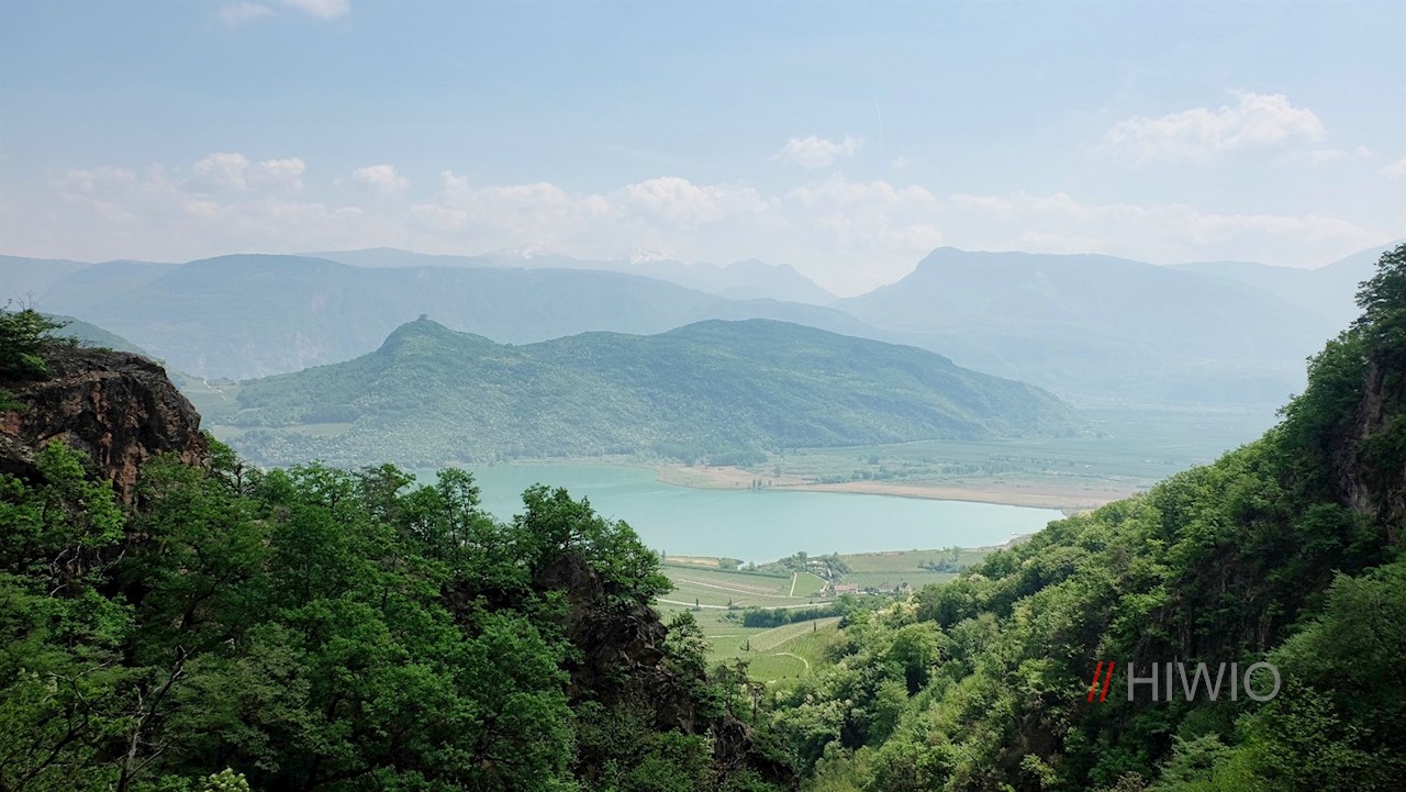 Über eine Hängebrücke wandert man in Richtung Altenburg weiter. Etwas unterhalb dieses beschaulichen Weilers gibt ein Aussichtspunkt malerische Ausblicke frei: Während sich zu unseren Füßen der Kalterer See mit der über ihn wachenden Leuchtenburg ausdehnt, ragen im Hintergrund unter anderem das Rittner Horn, das Weißhorn und das Schwarzhorn in die Höhe.
