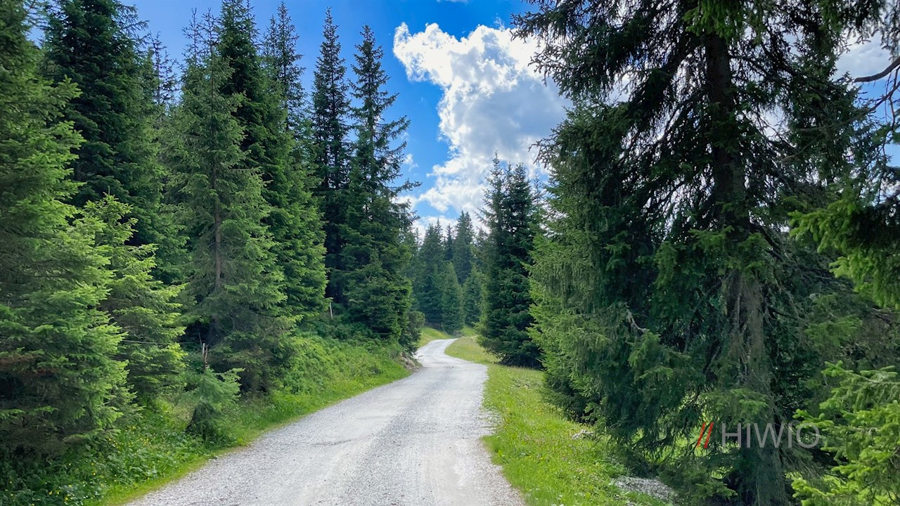 Von hier folgt der Ratschinger Almenweg zunächst dem breiten Waldweg Nr. 19B, von dem er wenig später links abzweigt und sich im sanften Anstieg durch lichten Wald und blumenfrohe Weidewiesen zieht.