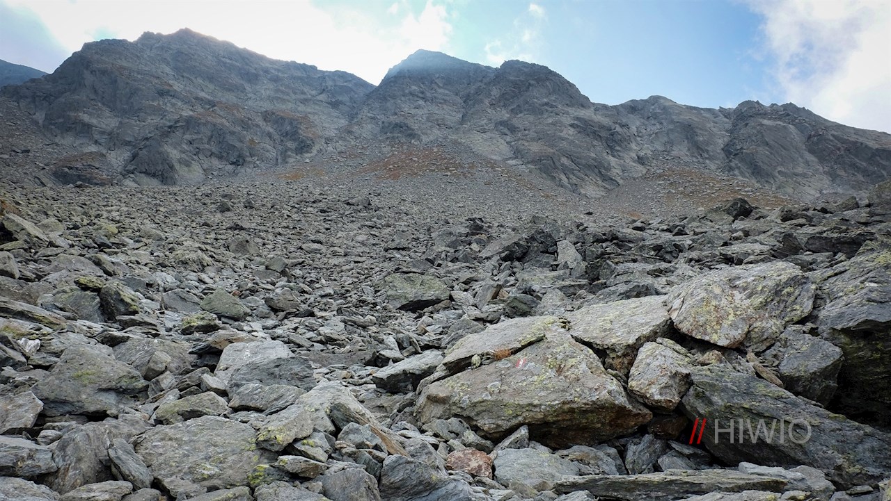 Weiterhin der Wegnummer 33 folgend, führt die Wanderung nun im großenteils steten Anstieg über Blockgestein zur Klausenscharte empor.