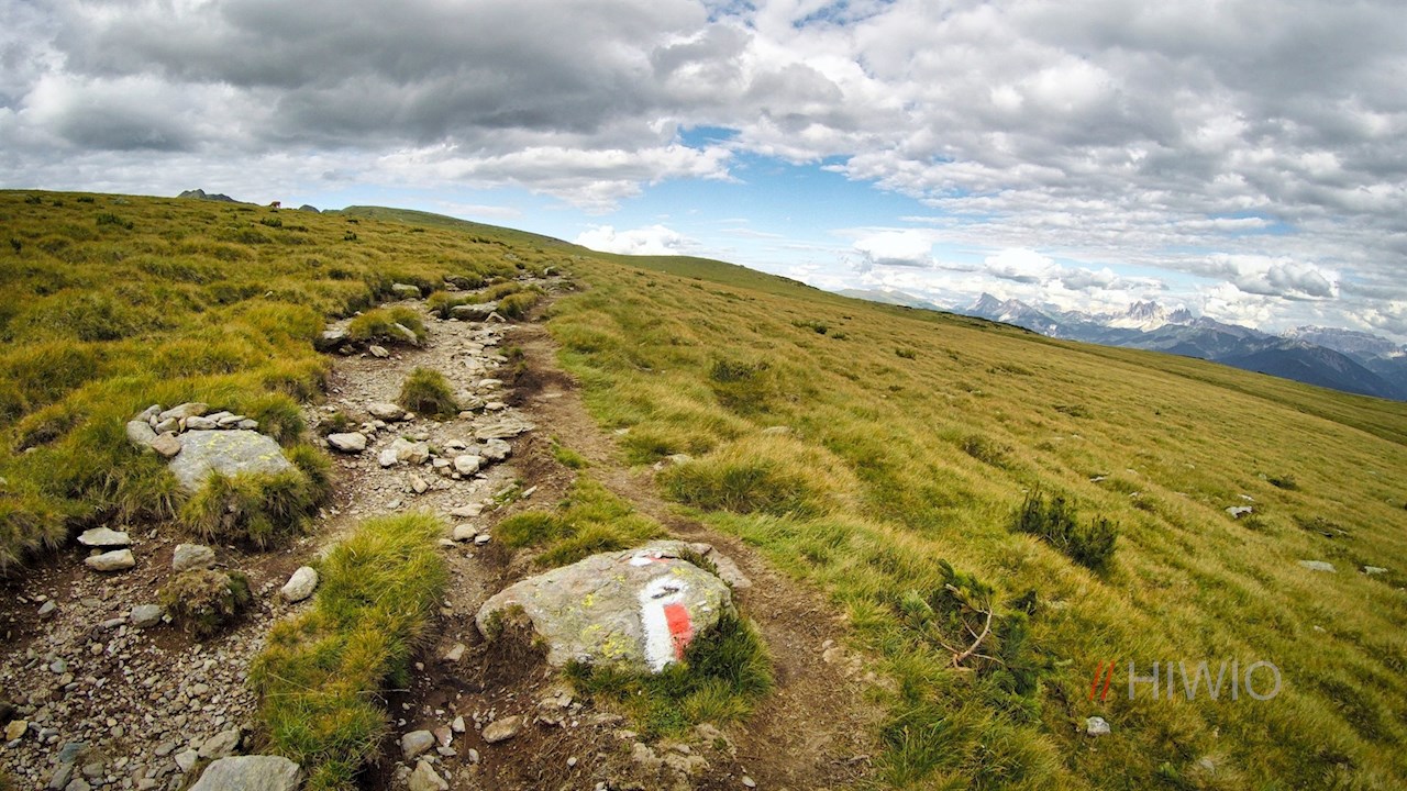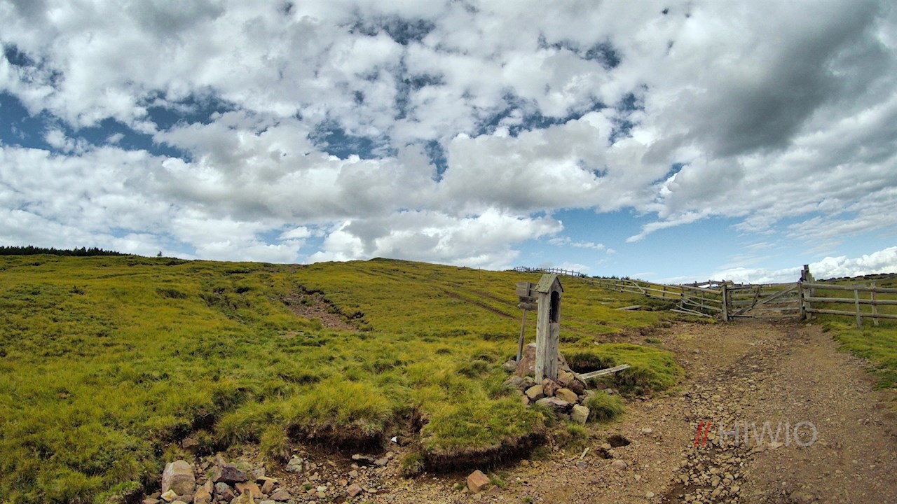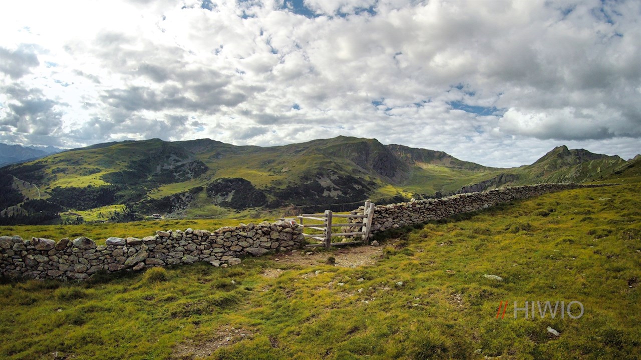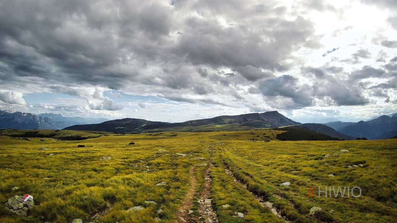 Auf zunehmend stein- und felsbeschlageneren Wegen führt die Wanderung nun im sanften Anstieg und zuletzt in recht steilen Serpentinen auf die Villanderer Alm. Eine kleine Steinmauer markiert den Übergang zwischen dem Sarntal und dem Eisacktal, auf dem sich ein atemberaubend schöner Ausblick auf die sanft gewellte Villanderer Alm und die gegenüberliegenden Dolomiten vom Peitlerkofel bis zum Latemar entfaltet.