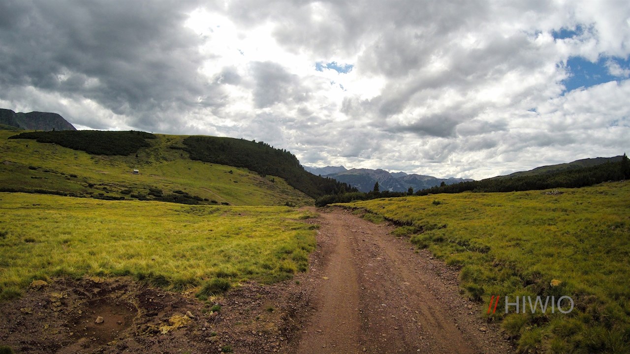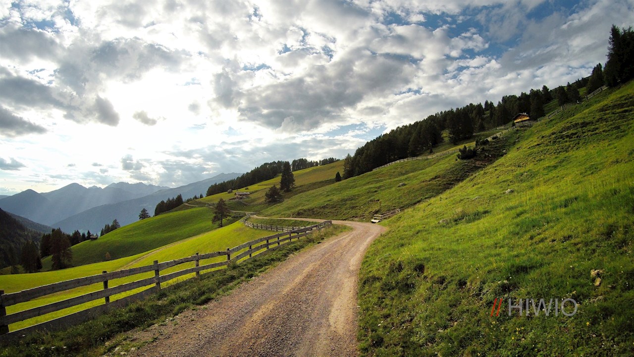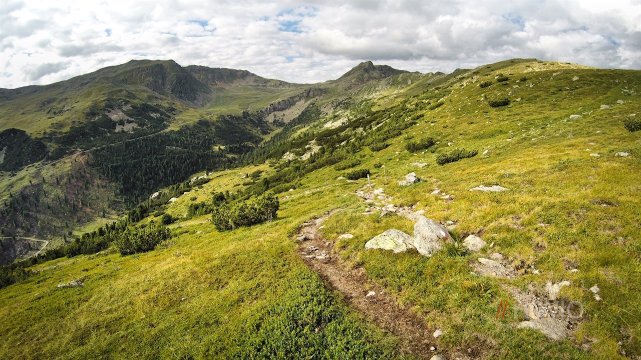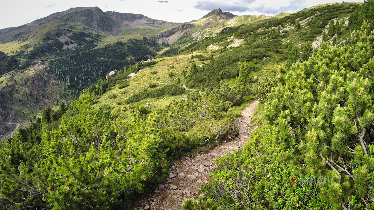 Auf zunehmend stein- und felsbeschlageneren Wegen führt die Wanderung nun im sanften Anstieg und zuletzt in recht steilen Serpentinen auf die Villanderer Alm. Eine kleine Steinmauer markiert den Übergang zwischen dem Sarntal und dem Eisacktal, auf dem sich ein atemberaubend schöner Ausblick auf die sanft gewellte Villanderer Alm und die gegenüberliegenden Dolomiten vom Peitlerkofel bis zum Latemar entfaltet.