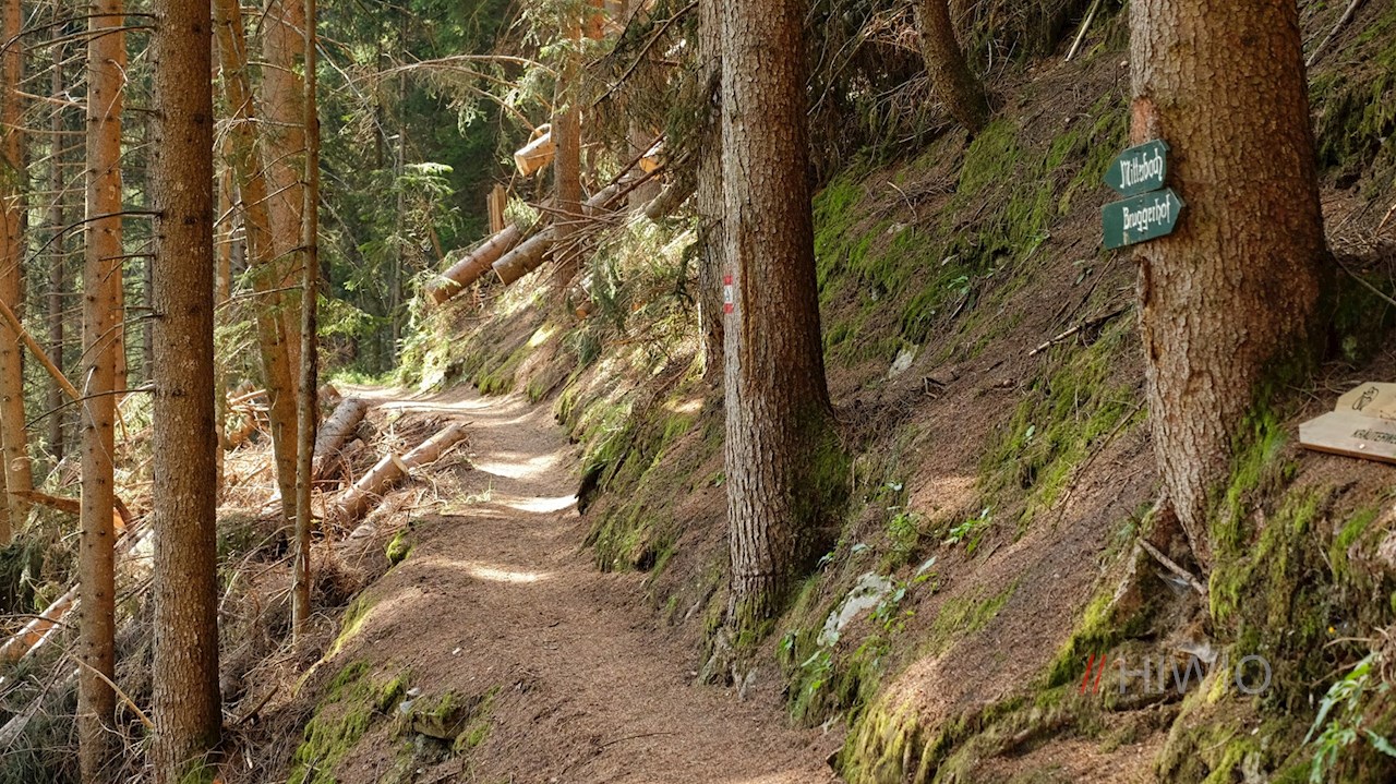 Wenig später biegt links der anfangs steil ansteigende Wiesensteig Nr. 16a zur Riesa Alm ab. Nach diesem ersten Steilstück quert er nahezu eben die steil abfallenden Wiesen- und Waldhänge und öffnet dabei malerische Ausblicke auf Weißenbach und die ringsum aufragende Bergwelt.