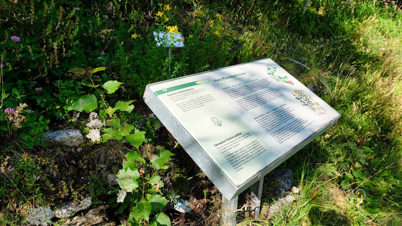 Längs des Weges trifft der Wanderer auf liebevoll und anschaulich angelegte Kräuterbeete, neben denen anregend gestaltete Informationstafeln interessante Einblicke in Südtirols Kräuterwelt gewähren. So erfährt er beispielsweise, dass das gelbe Johanniskraut seelische und körperliche Verletzungen wie Verbrennungen oder Depressionen lindert, die Ringelblume die Wundheilung erleichtert oder der Löwenzahn alle Drüsen des Körpers anregt.
