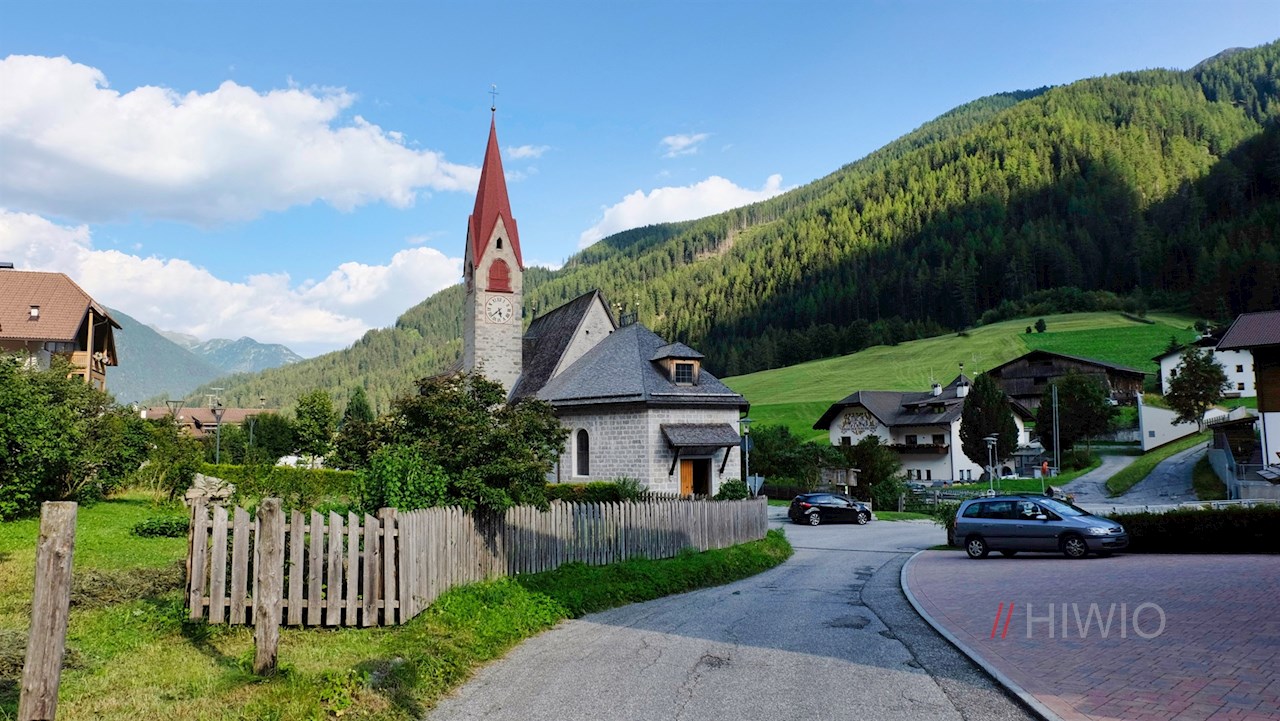 Die Wanderung zur Riesa Alm beginnt im Bergdorf Weißenbach bei Luttach. Neben der pittoresken Jakobskirche finden sich einige Parkmöglichkeiten.