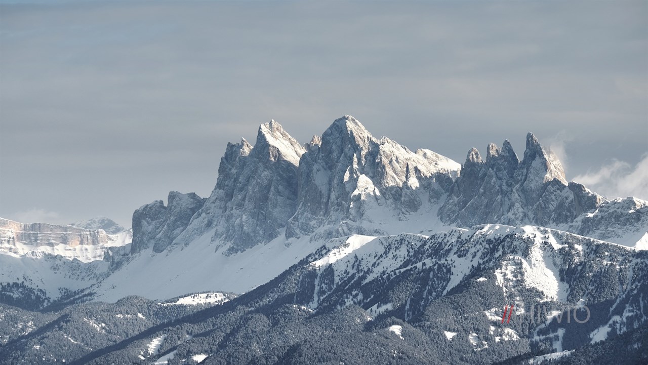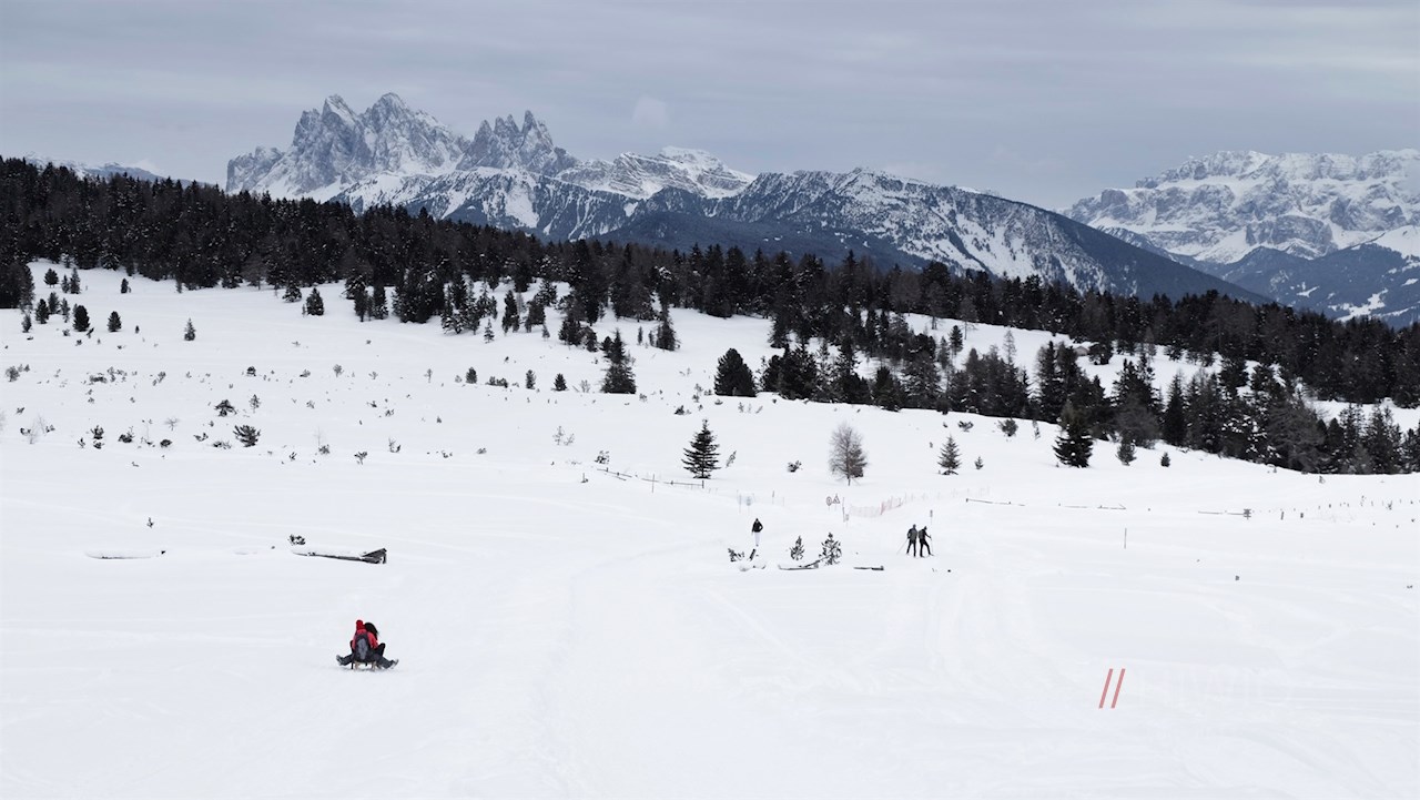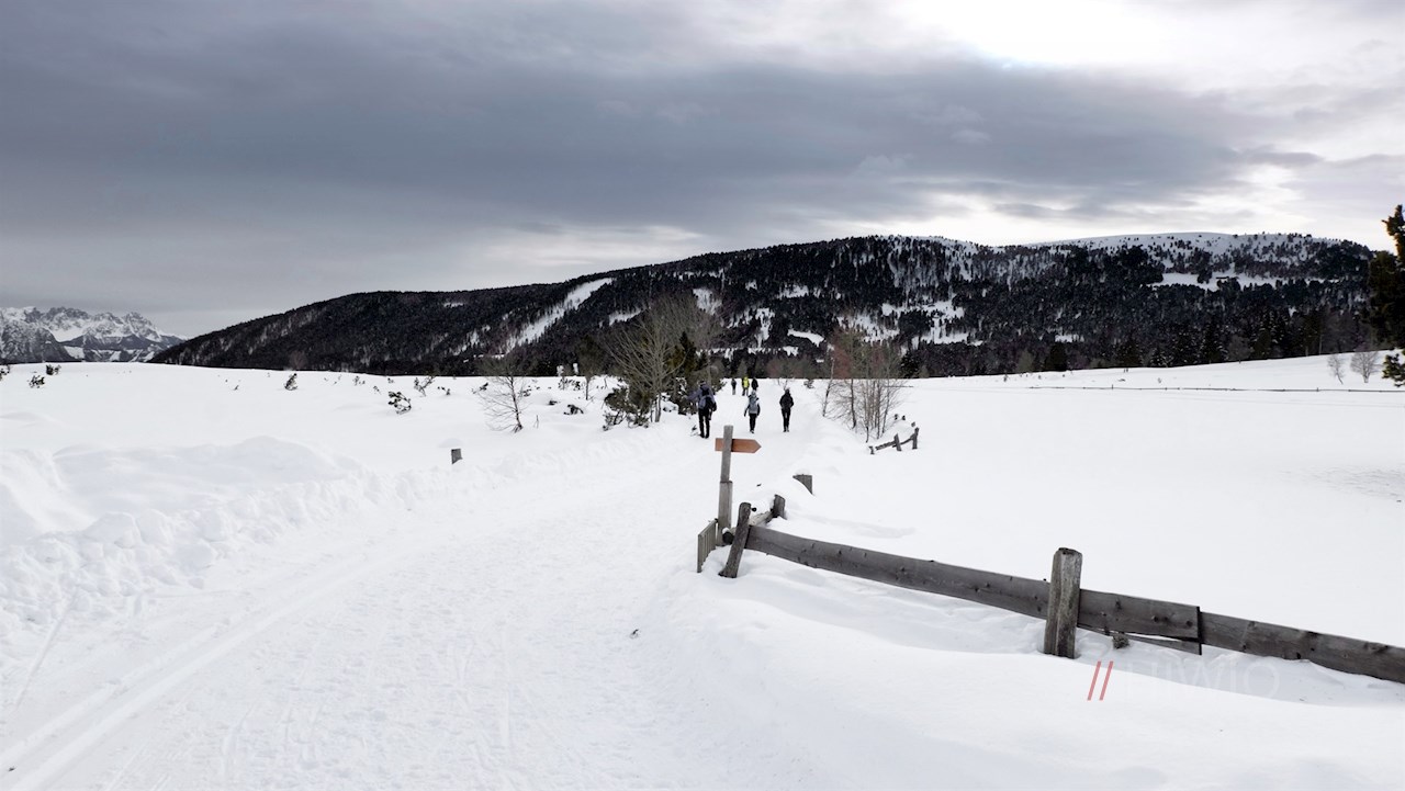 Neben der Gasserhütte zweigt der gut gespurte Wanderweg Nr. 6/15 ab. Er führt im sanften Anstieg durch die weiten, schneebedeckten Almwiesen und öffnet dabei malerische Ausblicke auf den weiß schimmernden Villanderer Berg und die hinter uns aufragenden Dolomiten.