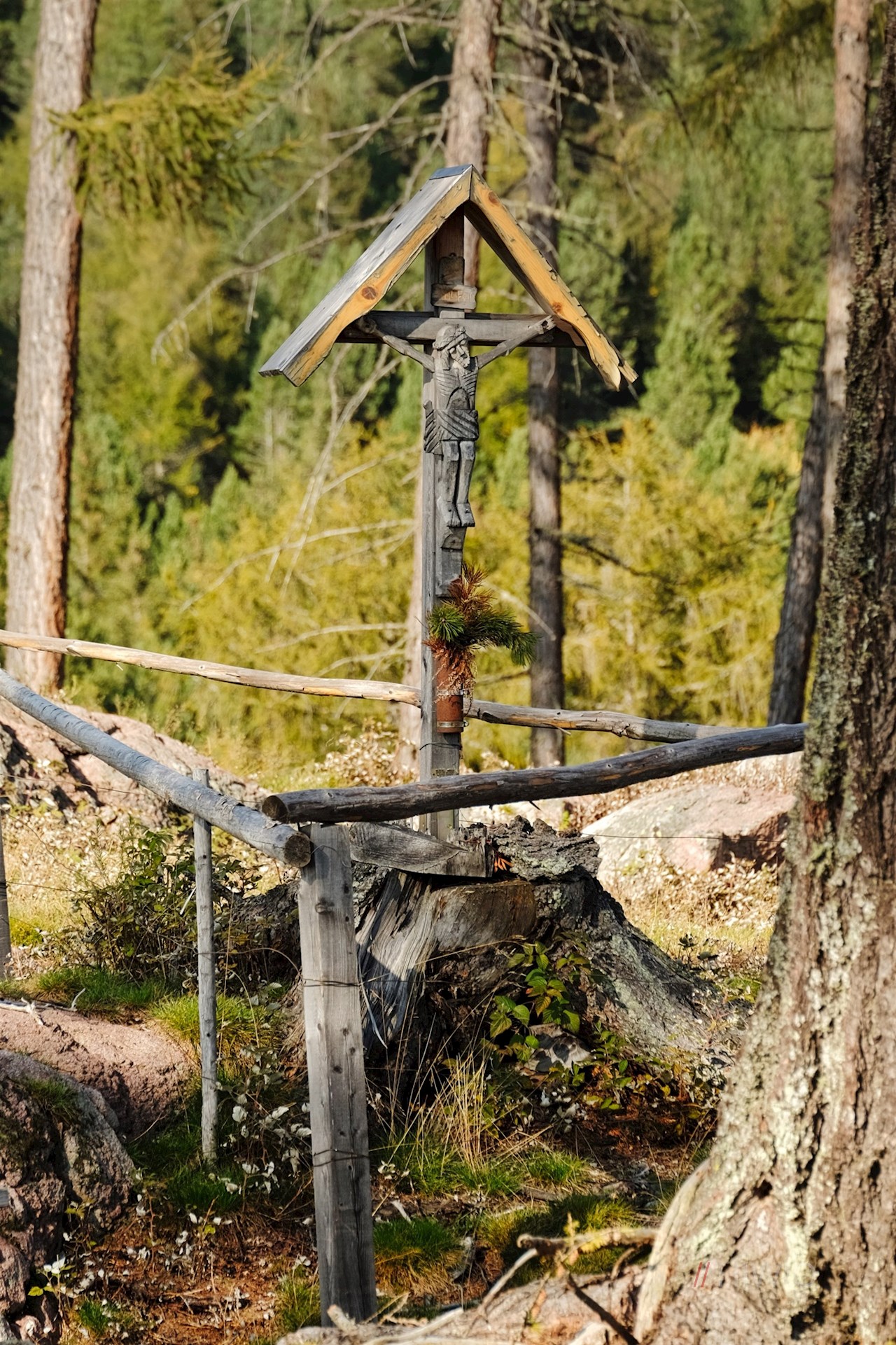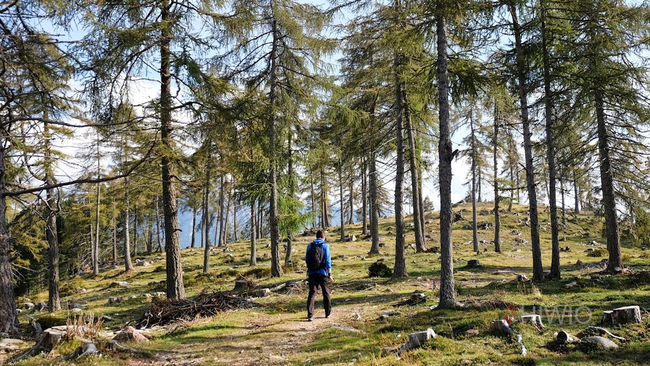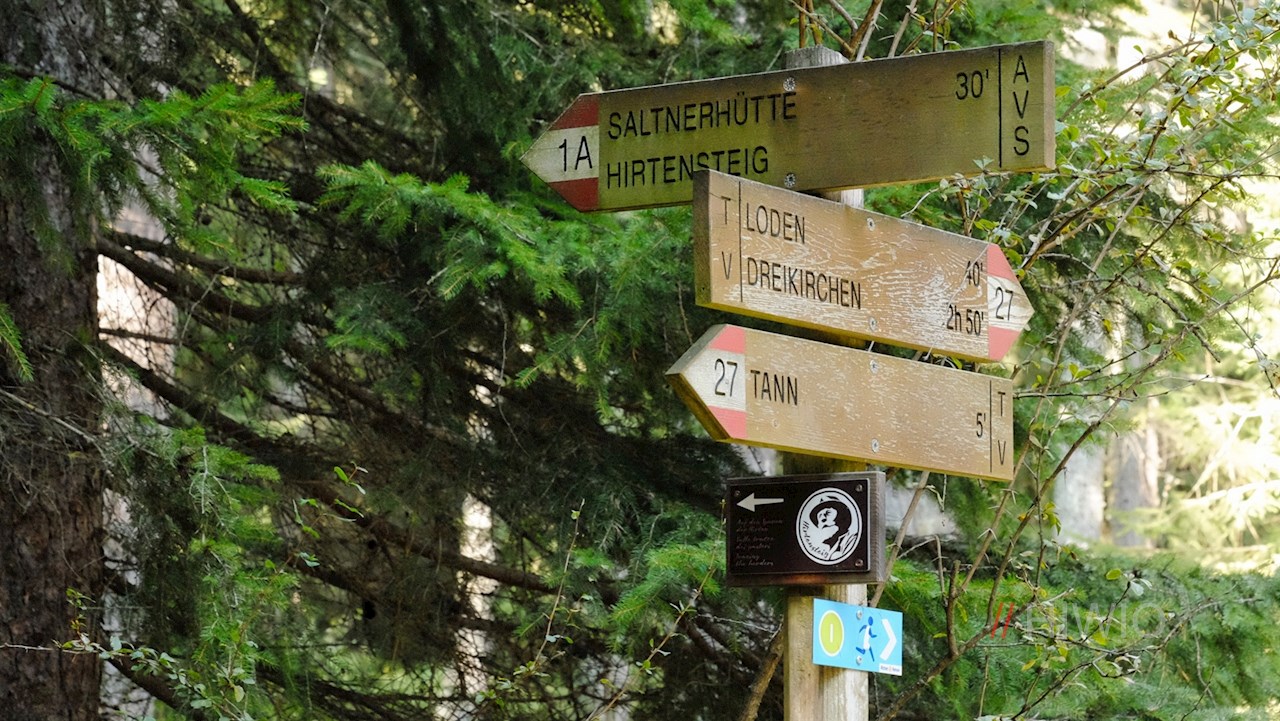 Die Wanderung auf dem Hirtenweg beginnt auf dem Wanderparkplatz neben dem Waldhotel Tann bei Klobenstein. Stets dem Hirtensymbol folgend, taucht der Hirtenweg sogleich in einen schattenverheißenden Wald ein.