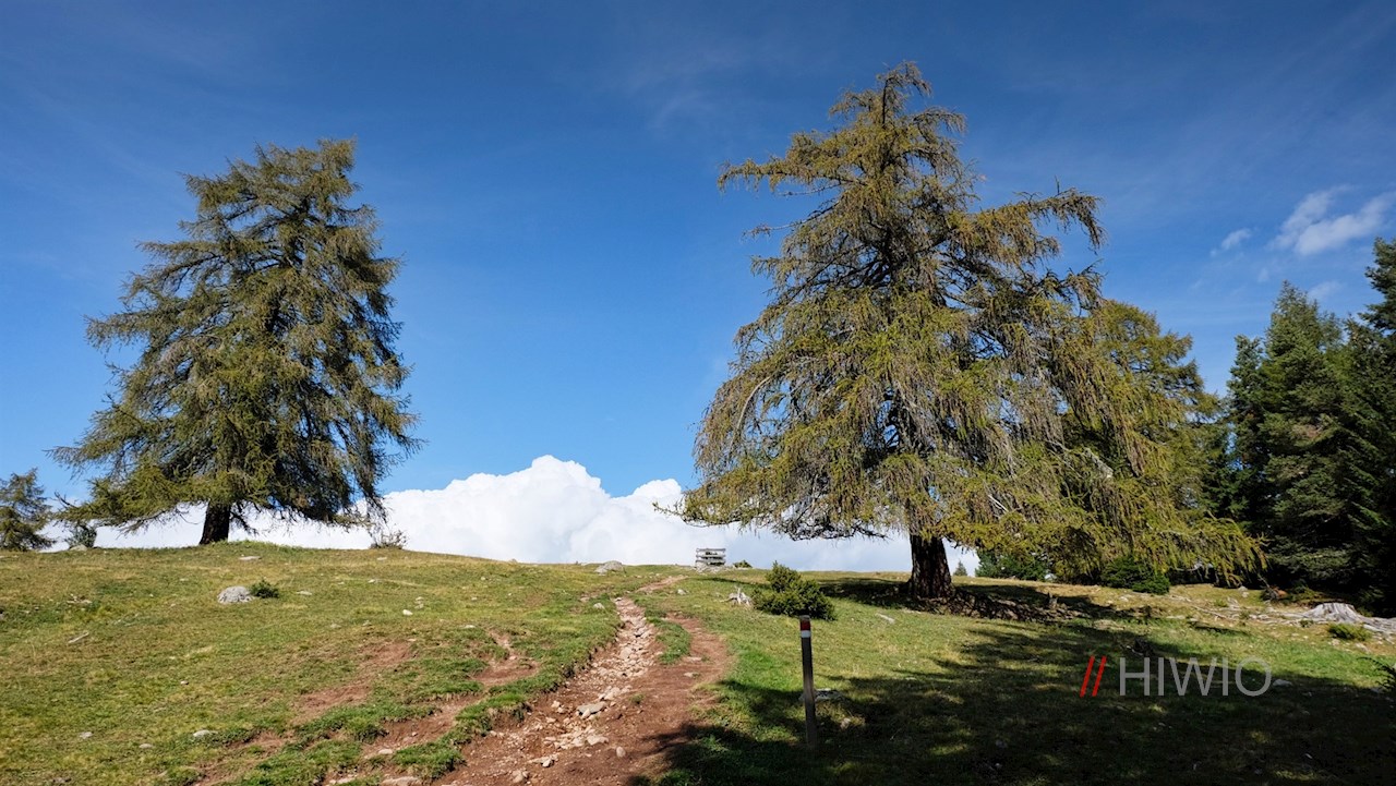 Wenig später zweigt am linken Wegesrand der Wanderweg Nr. 1A ab. Er führt im angenehmen Anstieg durch Wald und sanfte Weidewiesen zur Saltnerhütte am Fuße des Rittner Horn. Noch heute holen die Bauern hier am 13. September ihr Vieh ab, das sie alljährlich am 28. Mai in die Obhut der Hirten geben.