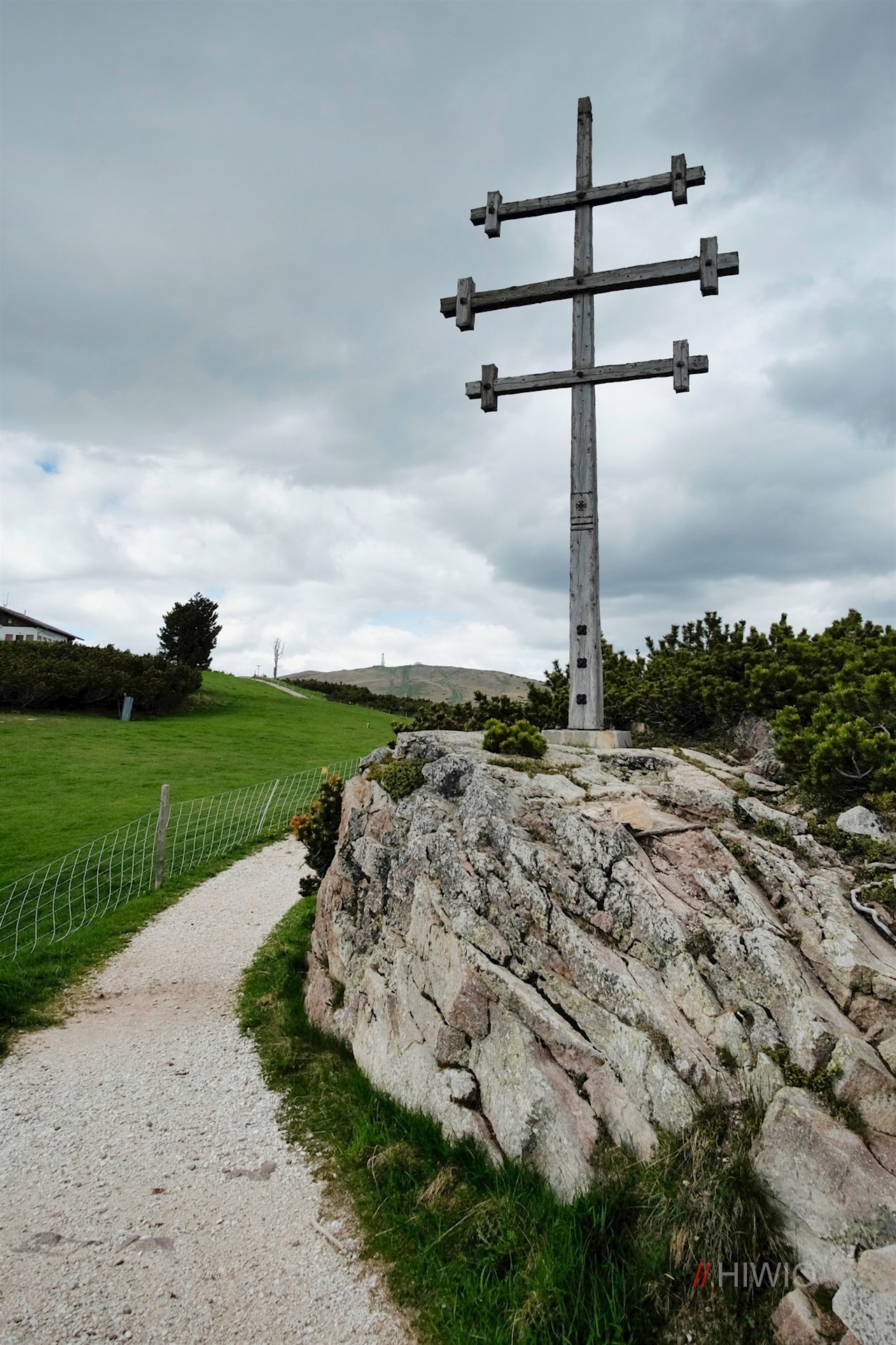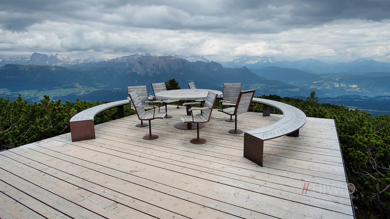 Oben angekommen, folgt man dem rechts abzweigenden „Panoramaweg“. Er führt vor der verträumten Kulisse der gegenüberliegenden Dolomiten an einem Wetterkreuz vorbei zum „Runden Tisch“. Auf dieser windgeschützten Aussichtsplattform eröffnet sich ein atemberaubender Ausblick auf die ringsum aufragenden Gipfel, deren Silhouetten und Namen auf dem Metallband verzeichnet sind, das den Panoramatisch umrahmt.