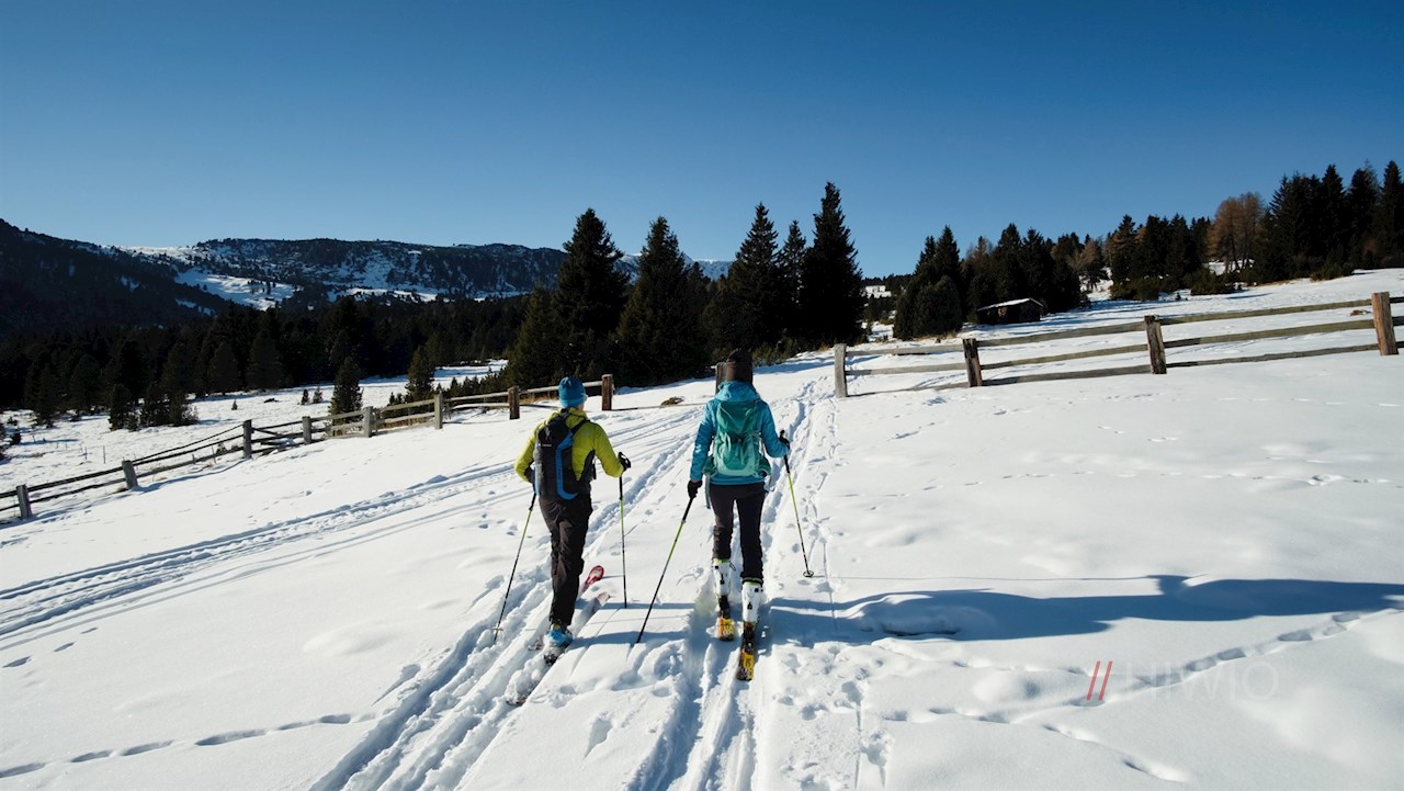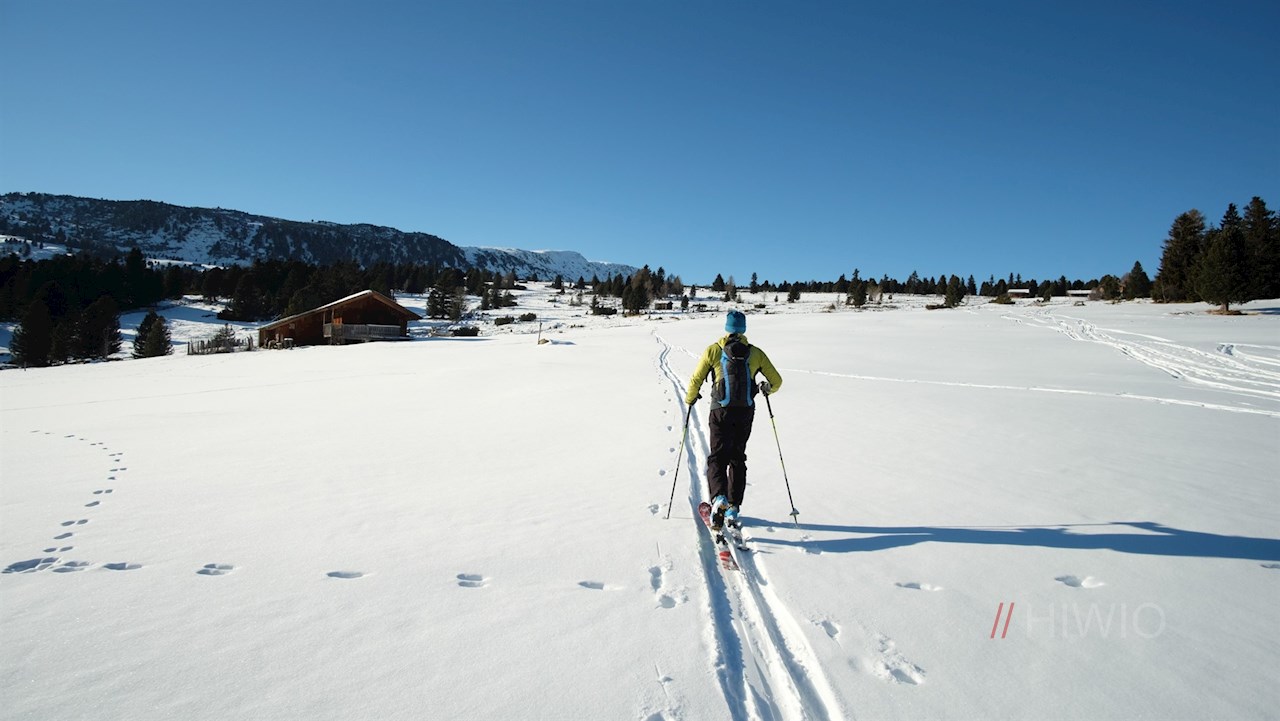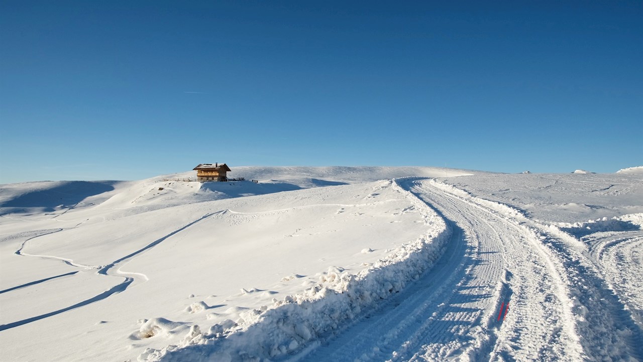 Während die meisten Schneeschuhwanderer den Rückweg vom Rittner Horn auf dem Hinweg antreten, gleiten die Skitourengeher über die freien Hänge zum Ausgangspunkt hinab. Dort verlockt die Gasserhütte zur genüsslichen Einkehr.