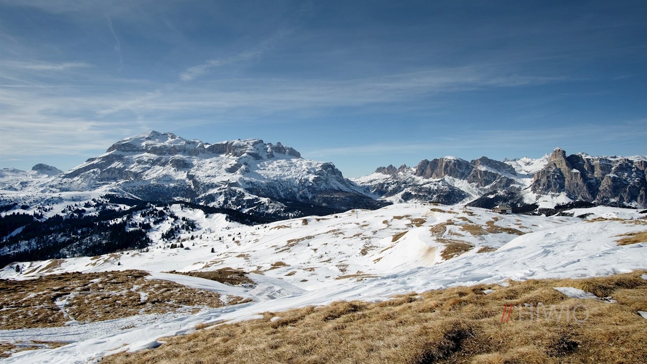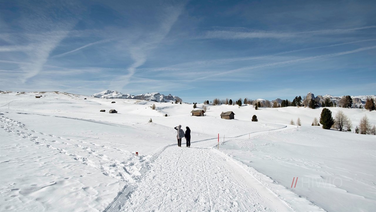Hinter der Waldgrenze dehnen sich schließlich die schneebedeckten, von einzelnen Holzhütten bestandenen Störeswiesen aus. Vor der malerischen Kulisse der ringsum aufragenden Dolomiten setzt sich die Wanderung im nunmehr sanfteren Anstieg in Richtung Störes fort.
