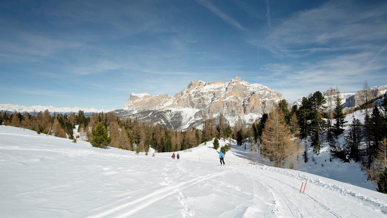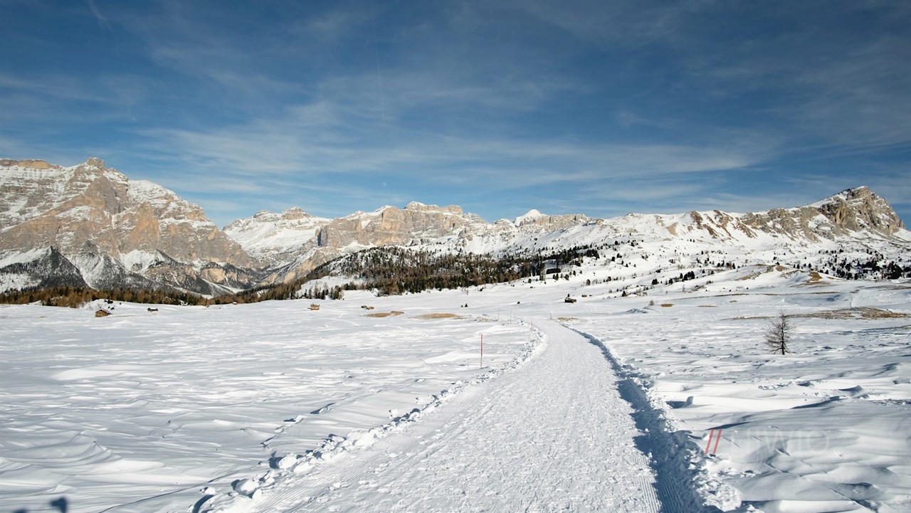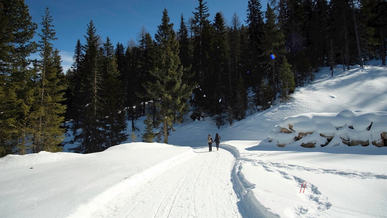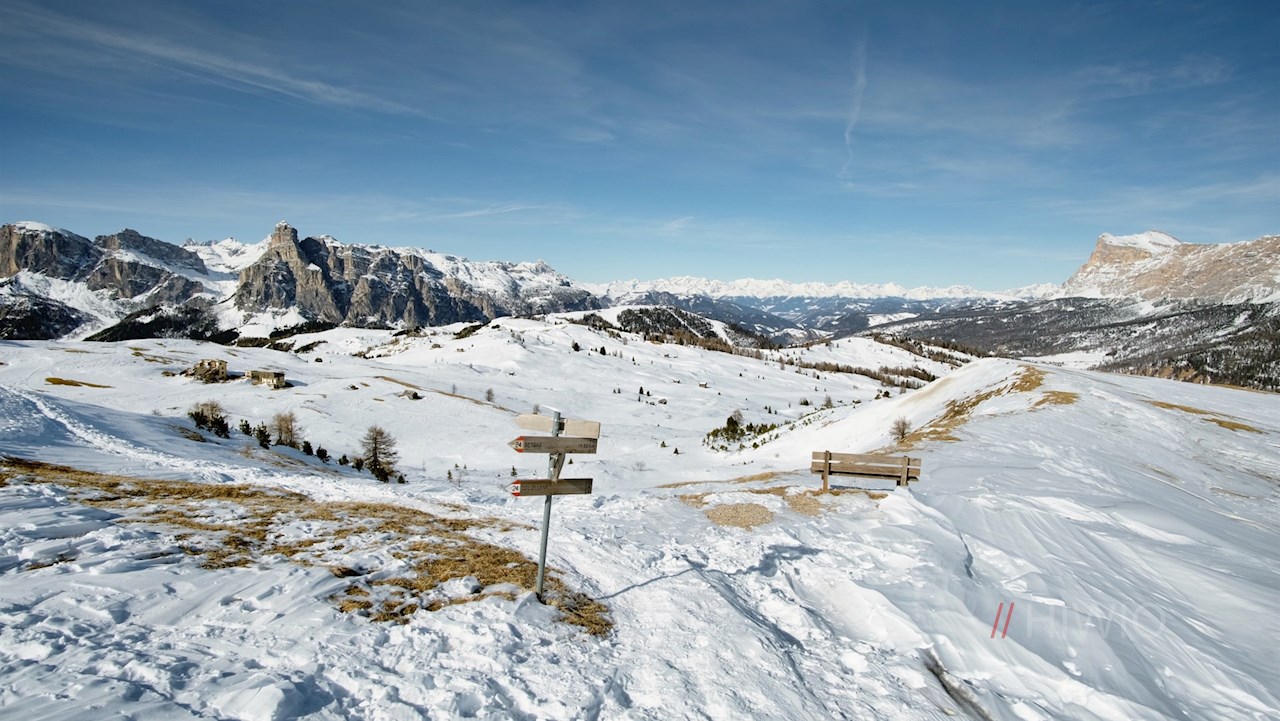 Auf der gegenüberliegenden Straßenseite zweigt der gebahnte Winterwanderweg Nr. 24B in Richtung Pralongià ab. Er führt nahezu eben durch die verschneiten Wiesen und geht an der nächsten Weggabelung in einen sanft ansteigenden Waldweg über.