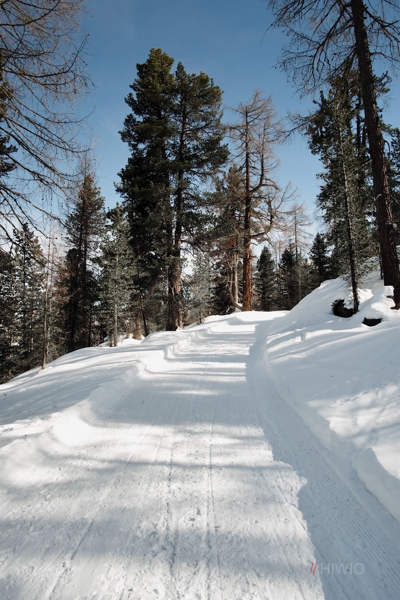 Wenig später mündet er in den Weg Nr. 24A, der sich im angenehmen Anstieg durch den winterlich verschneiten, zunehmend lichter werdenden Wald schlängelt.