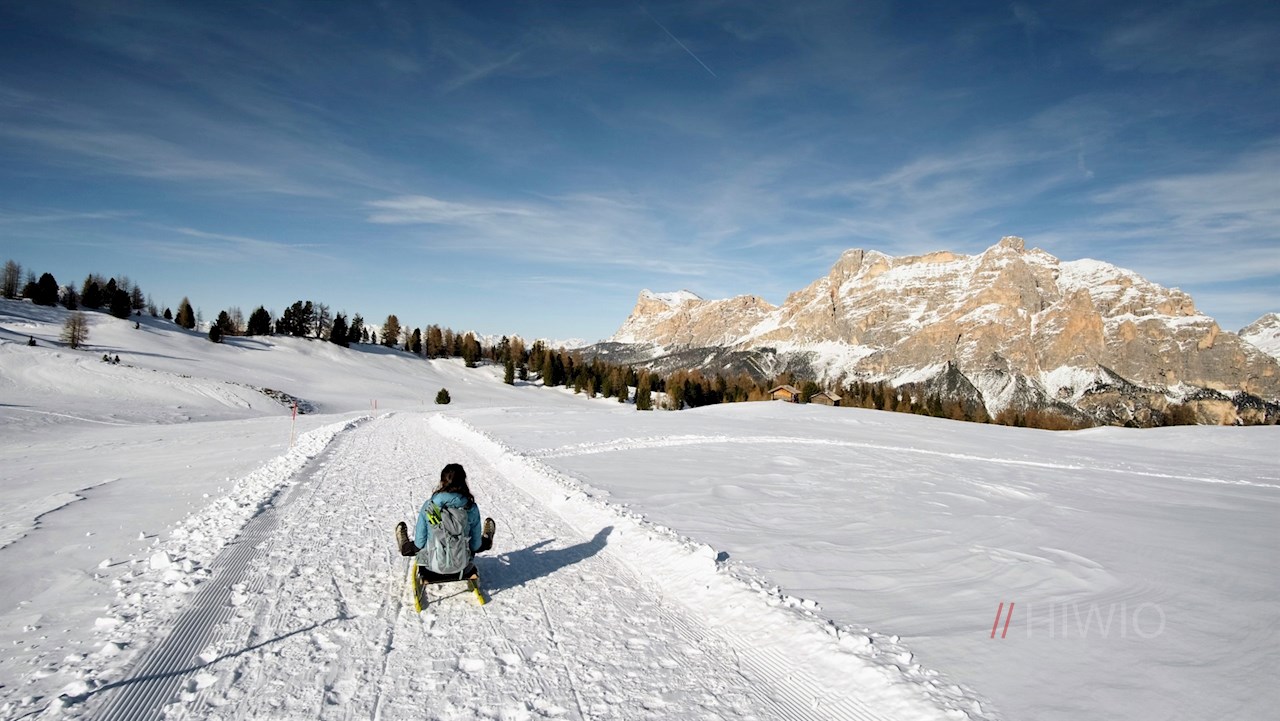 Wer möchte, kann noch einen kleinen Abstecher zu dieser beliebten Berghütte machen. Wir aber schwingen uns auf unsere Rodeln und gleiten vor herrlicher Kulisse zum Ausgangspunkt bei St. Kassian hinab.